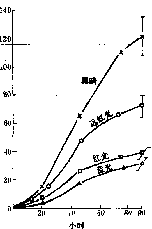 光形态建成的作用模式 光输入后被感应的色素(光感受体)吸收,释放出特定的信号并通过传导系统到达可感受的细胞,在细胞功能的作用下最终表现出各种反映。 当色素系统感受光释放出信号经传导链而到达某细胞时,该细胞能否起反响决定于该细胞是否处于感受状态,而与感光色素的量无关。该细胞对接受光感受体释放的信号而产生反响的专一性,与该细胞的分化在空间和时间上的特殊性密切相关,存在着该细胞或组织的空间感受模式和时间感受模式。所以,光形态建成反映是光敏色素(包括隐花色素)与特定的细胞功能相互作用共同完成的。其中必须经过模式的设计和模式的展现两个步骤,二者都在细胞分化过程中受基因控制。由于模式的设计而使细胞分化的空间程序为不同的细胞提供了对光敏色素产生特殊反映,在光敏色素作用的触发下而使模式得以展现(图4)。图中白芥幼苗根据模式设计的预定空间程序,表皮细胞(毛状异细胞)只能形成根毛,不能形成花色素苷,而全部亚表皮细胞都可形成花色素苷,它们同皮层细胞的伸长都因光敏色素作用受到抑制。在光下由于被光敏色素传导的信号所触发,完成模式的展现。不同的细胞除了在空间感受模式中有特殊地位外,对光的反映还存在着时间感受模式,故模式设计空间程序的展现还必须与时间感受模式协调一致才能最终完成(图5)。图中白芥幼苗于播种后不同时间内从暗中移至光下,由于光敏色素的作用合成花色素苷,其时间进程表现出有不同的起始点和最适宜的合成时间。可见花色素苷在幼苗中的形成不仅受空间感受模式的支配,而且还受时间感受模式的支配。