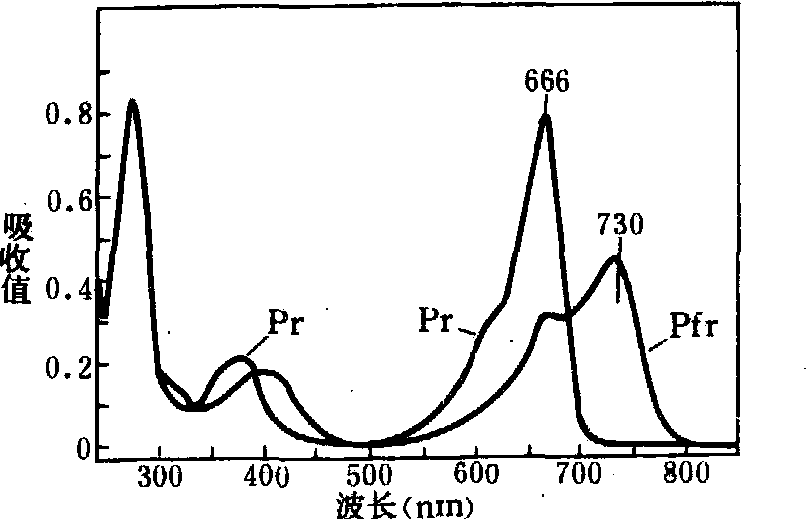 当幼苗进一步生长进入营养生长期,其形态建成仍受光的控制。如蒲公英叶的分类特征是具有深沟槽的锯齿形叶缘,这必须在完成光周期后每天不少于10小时光照,保证积累有一定量的Pfr型光敏色素时才能表现出来,如果10小时光照被远红光所打断,则叶子只显出其分类特征的一些痕迹。茎的生长同样也受光的调节,郁闭的叶层使茎基部富于远红光,从而加速茎的伸长,但茎的分枝(包括分蘖)则受到抑制。所以植物群落的内部植株高并且分枝分蘖少,边缘则株矮并且分枝分蘖多。叶层越郁闭该现象越明显。 光与开花成熟 开花成熟对光的需求受光周期反应的调节(见光周期现象)。 光与细胞器形成 细胞器的形成也受到光的调节。如被子植物必须在光下才能形成叶绿体,否则只能分化为富含原片层体的黄化质体而无类囊体膜系统。同时也不能形成叶绿素,只能积累原脱植基叶绿素,只有在光下随着叶绿素的形成才能出现完善的类囊体膜系统而发育成叶绿体。这个转变过程的光感受体除原脱植基叶绿素外,光敏色素起了决定性作用。光敏色素还控制着膜上捕光叶绿素a/b蛋白复合物、32KD蛋白(除草剂结合蛋白)以及二磷酸核酮糖(RuBP)羧化酶、3-磷酸甘油醛脱氢酶、磷酸烯醇式丙酮酸羧化酶等酶类的形成。光对这些膜蛋白或酶蛋白合成的触发作用是通过光敏色素调节了质体和细胞核两个遗传系统及其相互作用而完成的。 种子成熟和萌发时,细胞内的线粒体也同叶绿体一样发生形态结构上的转变。随种子的脱水和成熟,其膜结构和呼吸酶类消失,代谢活跃的线粒体转变为贮存形式的原线粒体; 当种子萌芽并在光的触发和光敏色素控制下,才能重新转变为结构完善和具有代谢活性的线粒体。在光下正常发育的白芥子叶栅状薄壁组织线粒体的构象特征是内膜系统呈不规则排列的弯管状(小囊形),但在黑暗中只能形成原线粒体,并或多或少地增大成为圆柱形颗粒,内膜系统成为平行排列的薄片状的嵴。 光敏色素和隐花色素 光敏色素是光形态建成的主要调节者(图2)。关于光敏色素的理化性质、结构和作用机理(见光敏色素)。