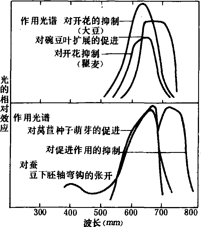 隐花色素存在于隐花植物中,其性质尚不清楚,主要对低等植物的光形态建成起支配作用。现已发现隐花色素也存在于进化程度较高的十字花科植物中,可能也广泛存在于其他高等植物内。它控制着受蓝光调节的光形态建成反映,典型的效应是植物向光性反映。近年又发现蓝光和紫外光可促进高粱幼苗叶绿素的形成和中胚轴花色素苷的形成,并使高粱中胚轴和白芥下胚轴的伸长受抑制,从而证实隐花色素也控制着高等植物光形态建成的多种反映。隐花色素只负责起始的光诱导作用,然后在光敏色素的共同作用下完成最终的形态建成反映。目前尚未能将它提取和纯化,所有关于隐花色素的实验证据都来自间接的生理性反映。从蓝光效应的作用光谱观察,它在370nm附近有一宽峰,在420、440、480nm附近还有三个峰或肩(图3)。光谱特性表明黄素和胡萝卜素都可能是隐花色素的光感受体 但实验证明没有胡萝卜素存在的植株仍能产生蓝光的效应,故黄色素才是隐花色素的光感受体,它以非共价键与蛋白质结合。黄色素分子的某些功能基团尚不清楚。