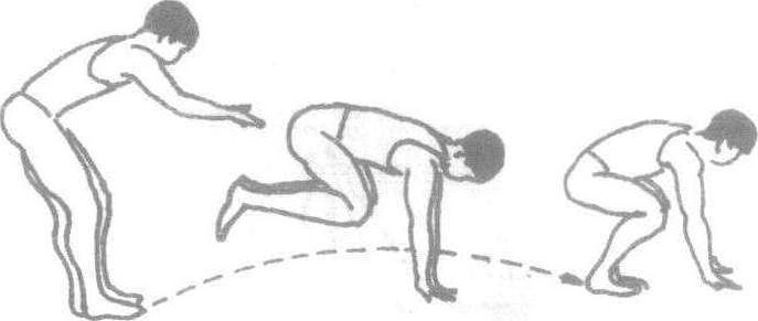 适用于4—6年级。可以发展学生的腰、腿力量和协调灵敏素质。器材 垫子8—10块。场地 把垫子排成两个竖排, 垫与垫之间连接要紧。游戏方法 把学生分成人数相等的两组。预备时,两组第一名学生屈膝半蹲,两臂后举。教师发出开始的口令后, 第一名学生两臂用力前摆, 同时两脚蹬地跃起,两手撑垫,收腹屈腿,两脚落地成半蹲。然后按上述方法再做。看谁做得最协调、灵敏。全体学生做完后教师给予评定。