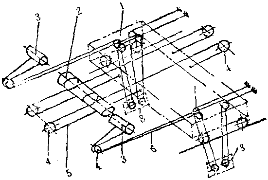 这种小车采用外部驱动,其起升驱动装置和小车行走驱动装置都装设在固定于桥架后部的机器房内。集装箱的升降及小车行走全靠绳索牵引来实现。它的主要优点是小车自重轻,因而作用于起重机金属结构上的载荷减小,整机自重减轻、轮压减小,码头建造费用相应降低。由于不存在驱动车轮打滑问题,小车可作高速行走,起功和加速性能较好,这对提高起重机的生产效率具有积极的意义。其缺点是钢丝绳缠绕系统复杂、维修不便、钢丝绳容易磨损、更换钢丝绳比较费事、由于钢丝绳下垂而影响吊具精确对位等。如图示。