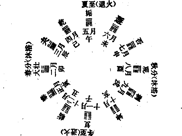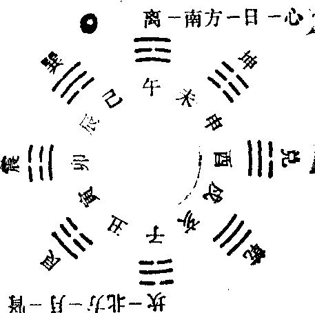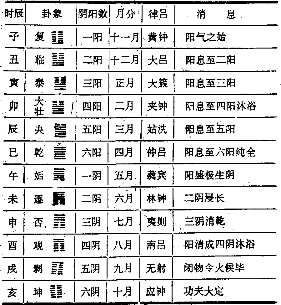 (后汉·荀爽《易注》)。“消息”在古代气功中即为火候,进阳火为阳息,退阴符为阴消。所以在《周易参同契》中就结合一年十二月以比喻火候说:“朔旦为复䷗,阳气始通,出入无疾,立表微刚,黄钟建子,兆乃滋彰,播施柔暖, 黎蒸得常;临䷒炉施条, 开路正光, 光耀渐进, 日以益长,丑之大吕,结正低昂; 仰以成泰䷊, 刚柔并隆,阴阳交接,小往大来,辐凑于寅,运而趋时;渐历大壮䷡, 侠列卯门, 榆荚堕落, 还归本根, 刑德相负, 昼夜始分;夬䷪阴以退, 阳升而前, 洗濯羽翮, 振索宿尘; 乾䷀健盛明, 广被四邻, 阳终于己,中而相干, 姤䷫始纪绪, 履霜最先, 井底寒泉, 午为蕤宾, 宾服于阴, 阴为主人;遯䷠去世位, 收敛其精, 怀德俟时, 栖迟昧冥; 否䷋ 闭不通, 萌者不生,阴伸阳屈, 没阳姓名; 观䷓其权量, 察仲秋情, 任蓄微稚,老枯复荣,荠麦牙蘖,因冒以生; 剥䷖烂支体,消灭其形,化气既竭,亡失至神; 道穷则反,归乎坤䷁元,恒顺地理,承天布宣”。明 ·高濂《遵生八笺》收载的《心书》中有一段话,可以帮助理解《参同契》原文的涵义。他说:“盖气之始升,则为冬至,一阳生于六阴之下,其卦为复。阳气渐长,阴气渐消,故为丑,其卦为临。于寅,其卦为泰。于卯,其卦为大壮,节属春分,木旺在卯,真气熏蒸,是为沐浴。于辰,其卦为夬。于己,其卦为纯乾。六阳既极,一阴生于六阴之下,其卦为姤 。阴气渐长,阳气渐消,故为未,其卦为遯。于申,其卦为否,于酉,其卦为观,节属秋分,金旺在酉,真气熏蒸,是为沐浴。于戌,其卦为剥。于亥,其卦为坤。六阴既极,复变为一阴。一升一降,无暂休息”。 这里十二地支与十二月相配,古历法中称为 “月建”。至于黄钟等则称为“十二律”或“律吕”,它们依次为黄钟,大吕、太簇、夹钟、姑洗、仲吕、蕤宾、林钟、夷则、南吕、无射、应钟。它们与十二月的结合,除 《参同契的上述文字外,张景岳《类经附翼》上也说:“子黄钟,一阳复卦; 丑大吕,二阳临卦; 寅太簇,三阳泰卦; 卯夹钟,四阳大壮卦; 辰姑洗,五阳夬卦; 己仲吕,六阳乾卦; 午蕤宾,一阴姤卦; 未林钟,二阴遯卦; 申夷则,三阴否卦; 酉南吕,四阴观卦; 戌无射,五阴剥卦; 亥应钟,六阴坤卦”。 对以上文字,可用下列表格(见表二)及十二消息卦图(见图4),概括如下。 表二 图4 十二消息卦图 此外,还有用六十卦结合一个月三十日来指导火候的,这是把乾、坤卦为鼎炉,坎、离卦为药物而除外,所以有“六十卦火候图”(元·萧廷之的《金丹大成集》),该图从略。但是要说明的,无论是用六个卦、十二卦或六十卦图以指导掌握火候,它并不是呆板的,而是要根据练功中的景象来处理。正如元·俞琰的《周易参同契发挥》中所指出的“非轮刻搯时之候,乃身中天然之气候也”。 巽风 巽为风,这是《周易·说卦传》中的话,所以有的气功古籍中,就用巽风以代表呼吸。如崔希范 《入药镜》中的“起巽风”就是。在《性命圭旨》中还有“鼓之以橐籥,吹之以巽风,锻之以猛火”之说。这里是指鼓动了橐籥,以生巽风,而出现猛火,即是气功内丹功法中指的进阳火即“武火”。盖武火者,即呼吸之气急重吹逼,采取烹炼也”(《修道全指》)。 用作人身部位术语 (1) 《周易·说卦传》中说:“乾为首,坤为腹,震为足,巽为股,坎为耳,离为目,艮为手,兑为口”。由于气功是以人身作为锻炼对象,故也袭用过来。如乾为首,坤为腹,内丹功法中即以乾卦代表头部两眉之间的上丹田,用坤卦代表腹部的下丹田。内丹功法中还用外丹术中的鼎炉来代表上下丹田,以乾为鼎,坤为炉,故《悟真篇》中就直接说:“乾坤为鼎器”,“安炉立鼎法乾坤”。 (2) 《周易正义》上说:“坎为耳,坎北方之卦,主听,故为耳也; 离为目,南方之卦,主视,故为目也”。由于北方水属肾,南方火属心,故内丹功法就说“肾为坎,心为离”(如《金丹大成集》) 所以就有心肾相交,水火既济之说如前述。 坎卦☵中的阳, 离卦☲中的阴, 即阴中之阳,阳中之阴,内丹功法中还分别称作婴儿、姹女。如《金丹大成集》中说:“婴儿在肾,姹女在心”,也简称“坎男离女”。 (3) 《周易》中有“兑为口”之说,《道德经》 中有“塞其兑”之语,气功功法中常用的“垂帘塞兑”,除垂帘是指两目微露一线之光外,塞兑就是指轻闭合口。 ☚ 阴阳五行学说 脏腑学说 ☛ |