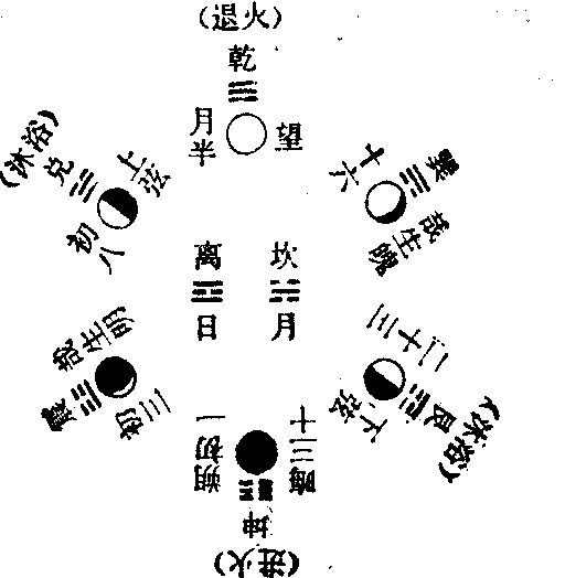 释义 | 八卦学说中国古典哲学、拳学理论。以八卦为基本来解释事物发展的定量关系。“八卦” 是古人在太极、河图、洛书等思想的基础上推衍而成的体系,它包含了阴阳、八卦、六十四卦等要素。《周易》是一部系统阐述八卦学说的著作。八卦学说的基本理论为: (1)八卦源于无极,可按爻的重叠推至无限大,其核心为阴阳互动。(2)八卦有先天与后天之别,各代表不同的功能阶段。(3)卦与卦之间有相互作用的连带关系。(4)世上万物均可依八卦分类,以六十四卦来解说功能与结构。(5)八卦是一个特殊的时空系统,事物的运动符合卦象理论。(6)八卦与人体相对应,即人体本身就是一个卦的结构。基本对应关系为: 头—乾,腹—坤 ,耳—坎,目—离,口—兑,股—巽,手—艮,足—震。 八卦学说 八卦学说八卦是《周易》中的八种基本图形, 用“ 图1 先天八卦图 图2 后天八卦图 由于坎卦属水,离卦属火,这种坎北离南的后天八卦图,也称水火未济,而未济是六十四卦之一,《周易·象传》上说:“火在水上, 未济 ![]() ![]() (2) 乾坤交媾: 根据内丹功法的理论,认为通过取坎填离的小周天过程,后天精气得到充实,并返还成先天精气,待有了一定景象后,就进入大周天过程。大周天采用先天八卦图进行指导。在先天八卦图上,南北方位已是乾、坤两卦,所以就称为乾坤交媾(元·萧廷之《金丹大成集》)有时也称为卯酉周天,这是因为在内丹功法中总是着眼在坎、离两卦上,而坎、离两卦,已处在卯酉的位置上,故大周天又称“卯酉周天”。 火候 火候原属内丹功法中不传之秘,因为真正要掌握好火候,必须具有《周易》卦象的基础知识,否则既说不清楚,也难以领会。所以宋·薛道光的《还丹复命篇》中就有“圣人传药不传火,从来火候少人知”之说,而都强调“临炉指点”,即具体指导。所说的“火”,就是练功中的用意,如《金仙证论》中说的:“火者神也,曰汞,曰日,曰乌,曰龙,皆我之真意也。”明·玄同子的《真诠》中明确说:“火候全在念头上着力”。而意念又要集注在呼吸上,如《规中指南》上说的:“火候之口诀,尤当于真息中求之”。再具体地说,“火候”就是一个进阳火——沐浴——退阴符(火)——沐浴这一过程,用意念掌握呼吸来完成,进火于子时,或“一阳生”; 开始退火于午时,或“一阴生”。整个过程在气功内丹功法中往往用一个月或一年的卦象来表示。 如用六个卦合一月的晦、朔、弦、望等来表示。《周易参同契》上说:“震☳出为征, 阳气造端, 初九潜龙;阳以三立, 阴以八通, 故三日震动, 八日兑☳ 行, 九二见龙, 和平有明; 三五德就, 乾☰体乃成, 九三夕惕; 亏折神符, 盛衰渐革, 终还其初, 巽 ☴继其统,固际操持, 九四或跃, 进退道危; 艮☶主进止, 不得逾时,二十三日,典守弦期,九五飞龙,天位加喜; 六五坤 承,结括终始,蕴养众子,世为类母,阳数已讫,讫则复起,推情合性,转而相与,上九亢龙,战德于野,用九翩翩,为道规矩,循据璇玑,升降上下,周流六爻”。还说:“三日出为爽, 震☳ 受庚西方, 八日兑☱受丁, 上弦平如绳, 十五乾☰体就, 盛满甲东方。蟾蜍与兔魄,日月气双明,蟾蜍眂卦节,兔者吐生光。七八道已讫, 屈折低下降, 十六转受统, 巽☴辛见平明, 艮☶直于丙南, 下弦二十三, 坤 ☷乙三十日,东北丧其明,节尽相禅与,继体复生龙,壬癸配甲乙,乾坤括始终”。 对这两段话,宋·陈显微《周易参同契解》中说: 这是“魏君以一月之间月形圆缺,喻卦象进退,自初三为一阳,初八为二阳,十五则三阳全而乾体就,十六则一阴生,二十三则二阴生,三十日则三阴全而坤体成”。这可用卦象图表示(见图3)。 图3 晦朔弦望卦象图 周流六爻,又称“周流六虚”。这是因为坎、离两卦两用,离为日,坎为月,已纳于中宫,其原位已空虚,阴阳消息,只周流于六卦之间。正如《周易参同契》上指出的:“坎离者,乾坤两用,两用无爻位,周流行六虚”。而六虚之说,也来自《周易·系辞传下》的“变动不居,周流六虚”。周流六虚也就是后来所说的周天、河车搬运。对前述周流六虚及配合月象变化的内容,还可用下列表格予以归纳说明: (见表一) 按哉生明、上弦、望、哉生魄、下弦、晦代表日期,均出于《尚书》。 如用十二个卦结合一年十二月来表示,虞翻注《周易·系辞传上》“变通莫大乎四时” 中指出:“交通趋时,谓十二消息也。泰、大壮、夬,配春; 乾、姤、遯,配夏;否、观、剥,配秋; 坤、复、临,配冬,谓十二月消息变通而周于四时也”。这十二卦就称为 “消息卦”,又称“辟卦”,以示它们在六十四卦中是主要的,为君,统率其余各卦。所以是“十二消息,阴阳往来无穷已,故通也 表一