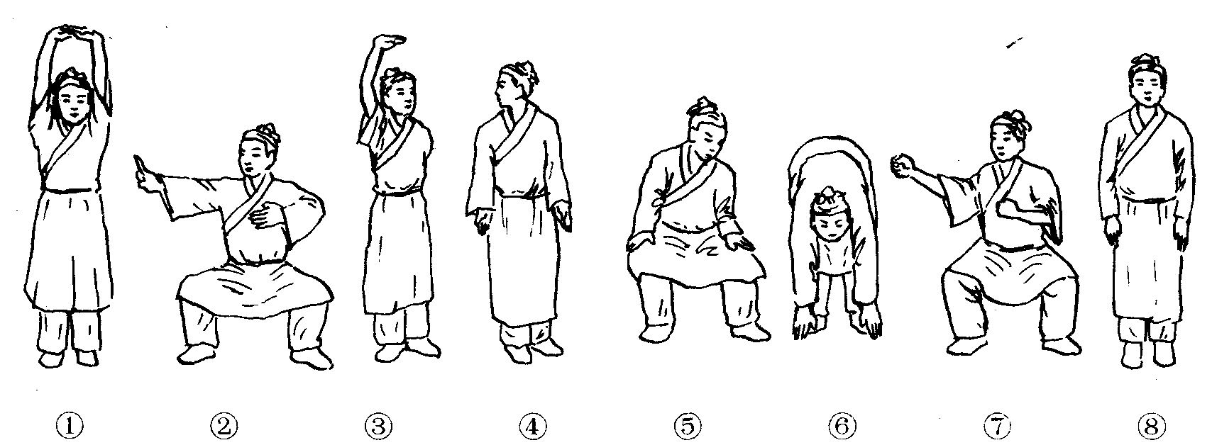 ☚ 老年人练习气功注意事项 十二段锦 ☛ 八段锦八篇。题 “醒世居士编辑”,“樵叟参订”,编撰者真实姓名不详。该书为白话短篇小说集,不分卷回,以段标目,共收小说八篇。第一段《惩贪色》,第二段 《戒惧内》,第三段 《赌妻子》,第四段 《对不如》,第五段 《儆容娶》,第六段 《悔嗜酒》,第七段《戒浪嘴》,第八段《蓄寡妇》。每段总题之下又列具体的偶句篇题。故事内容多涉家庭婚姻事,矛盾集中于奸情和财产纠纷,情节比较曲折,寓含劝惩说教和果报观念。故事时代多托以宋明之时,但实际反映的是清中叶社会生活,是根据民间传闻敷演创作而成。其中也有抄改他书的,如第一段采录冯梦龙《古今小说》卷三《新桥市韩五卖春情》,第六段出 《古今小说》卷五 《穷马周遭际卖𫘴媪》。 书中杂有色情描写, 清同治七年(1868)江苏巡抚丁日昌查禁淫书目录中有该书。有清醉月楼刊本,藏北京大学图书馆。 八段锦古代民间流传的一种健身防病体操。八段锦最早见于宋人洪迈所著《夷坚志》 : 北宋政和七年(1116年)有人 “尝以夜半起坐,嘘吸按摩,行所谓八段锦者” 。八段锦的歌诀是: 两手托天理三焦; 左右开弓似射雕; 调理脾胃单举手; 五劳七伤往后瞧; 摇头摆尾去心火; 两手攀足固肾腰;攥拳怒目增气力; 背后七颠百病消。八段锦经过元明清历代相传,形成了许多流派,如还有十二段锦、十六段锦等,还有南派北派之分。八段锦功法简洁易学,运动量可大可小,不受场地、气候、季节、赛材限止,男女老少皆宜。在练法上要求肢体运动与呼吸、意念等活动相结合进行,具有传统导引术的特点,因而至今广为流传。 八段锦 八段锦八段锦,是我国古代流传下来的一种著名动功功法。“八段”谓其节数,“锦”谓其珍贵。八段锦之名称,最早见于宋人洪迈所编的《夷坚志》中。据该书载,北宋政和七年,有人“效方士熊经鸟伸之术,尝以夜半起坐,行所谓八段锦者”。曾慥《道枢》及《灵剑子子午导引记》中已记载了八段锦的歌诀,迄今已有八百多年历史。在历代相传中,形成了很多流派,不但在练功姿势上有站式与坐式的不同,而且在动作风格上,也有南派、北派之区别。南派动作以柔为主,法简而易学,又名文八段。北派动作以刚为主,多用马步,术繁而难练,又名武八段。目前最为流行的是清朝光绪初梁世昌编撰的《易筋经图说》附录中所载,无名氏编订的《八段锦》功法。八段锦的名称及动作如下: ☚ 左洞真经按摩导引诀 灵剑子导引法 ☛ 八段锦ba duan jineight trigram exercise 八段锦ba duan jineight trigram boxing 《八段锦》ba duan jinEight Pieces of Brocade→醒世居士(xing shi ju shi) 八段锦eight trigrams boxing;baduanjin |