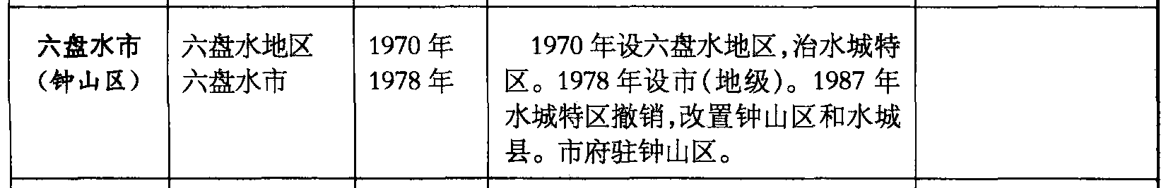 六盘水市(钟山区)六盘水地区六盘水市1970年1978年1970年设六盘水地区,治水城特区。1978年设市(地级)。1987年水城特区撤销,改置钟山区和水城县。市府驻钟山区。