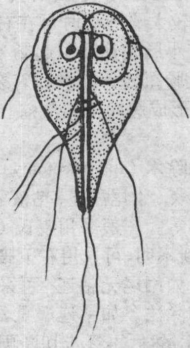 释义 | 兰氏贾第鞭毛虫Giardia lamblia寄生于人的肠道内,可引起贾第鞭毛虫病。生活史包括滋养体和包囊期。滋养体呈梨形,有4对鞭毛,行动活泼,包囊呈椭圆形。本虫分布全球,感染率儿童高于成人,常为旋游者腹泻的病因之一,主要是由于包囊污染水源或食物所致。常见症状为腹痛和腹泻,有时可因虫体侵入胆囊而引起绞痛和黄疸。免疫缺陷和大量使用免疫抑制剂者易发生严重感染。确诊有赖于粪便或十二指肠引液中查见包囊或滋养体。硝苯咪唑和甲苯咪唑有良好疗效(图)。 兰氏贾第鞭毛虫滋养体 |