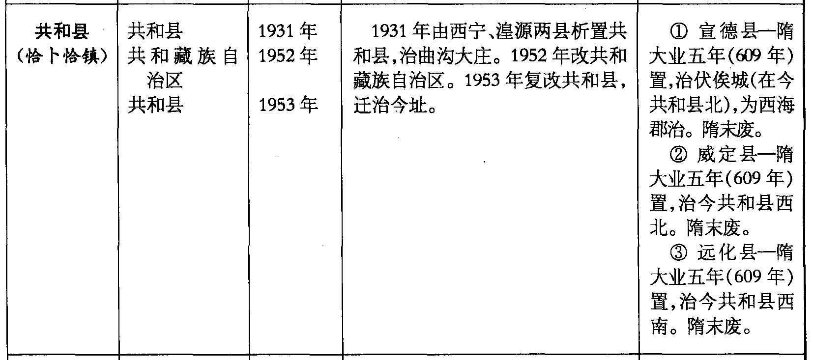 共和县(恰卜恰镇)共和县共和藏族自治区共和县1931年1952年1953年1931年由西宁、湟源两县析置共和县,治曲沟大庄。1952年改共和藏族自治区。1953年复改共和县,迁治今址。❶ 宣德县—隋大业五年(609年)置,治伏俟城(在今共和县北),为西海郡治。隋末废。❷ 威定县—隋大业五年(609年)置,治今共和县西北。隋末废。❸ 远化县—隋大业五年(609年)置,治今共和县西南。隋末废。