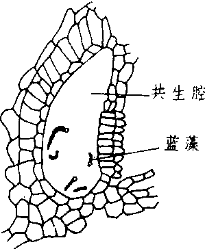 释义 | 共生腔symbiosis chamber水生植物细叶满江红(Azolla filicu-loides lamk)与鱼腥藻(Anabaene azol-lae strasb.)共生固氮的场所。位于满江红同化叶中部稍下凹处,上表面有比较密的肉质疣状突起,边缘由几行无色透明的细胞构成,基部增厚,内有含黏液的空腔。 同化叶上的共生腔(纵切面) |