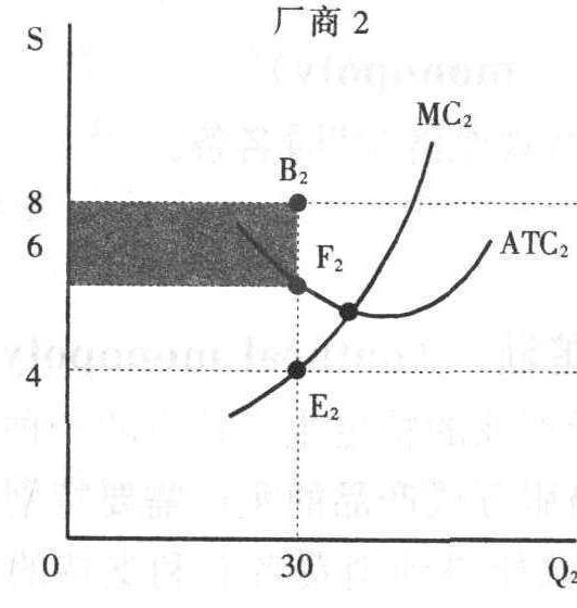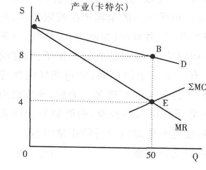 附图示出一个两家厂商的集中式卡特尔。图中D与MR是形成集中式卡特尔的两家厂商所生产的同质产品的市场总需求曲线和相应的MR曲线。整个卡特尔的 ∑MC曲线把两厂商的MC曲线水平地加总求得。集中化卡特尔当局把P确定在8美元,Q=50单位(卡特尔的MC与MR相交的E点上)。为使生产成本为最低,卡特尔当局将产量分配20单位给厂商1,30单位分给厂商2(分别地由MC1=MR的E1点和MC2=MR的E2点求出)。如在生产点MC1>MC2,则整个卡特尔把生产由厂商1转给厂商2就会使总生产成本降低,直到MC1=MC2为止。在卡特尔价格为P=8美元时,厂商1赚得利润共计20美元(1×20),厂商2赚得利润共计60美元(2×30)。这个结果与一个垄断者用两个工厂经营的情况相同。但厂商1在这情况下可能要求更加均等的利润分配,提出威胁要退出卡特尔。大多数卡特尔的主要弱点以及其失败的原因亦在于此。卡特尔成员往往具有强烈的经济动机搞欺诈,超过配额出售产品。