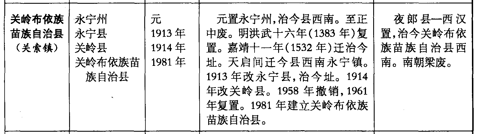 关岭布依族苗族自治县(关索镇) 关岭布依族苗族自治县(关索镇)永宁州 永宁县 关岭县 关岭布依族苗族自治县关岭布依族苗族自治县(关索镇) 永宁州 永宁县 关岭县 关岭布依族苗族自治县 元 1913年 1914年 1981年 元置永宁州,治今县西南。至正中废。明洪武十六年(1383年)复置。嘉靖十一年(1532年)迁治今址。天启间迁今县西南永宁镇。1913年改永宁县,治今址。1914年改关岭县。1958年撤销,1961年复置。1981年建立关岭布依族苗族自治县。 夜郎县—西汉置,治今关岭布依族苗族自治县西南。南朝梁废。