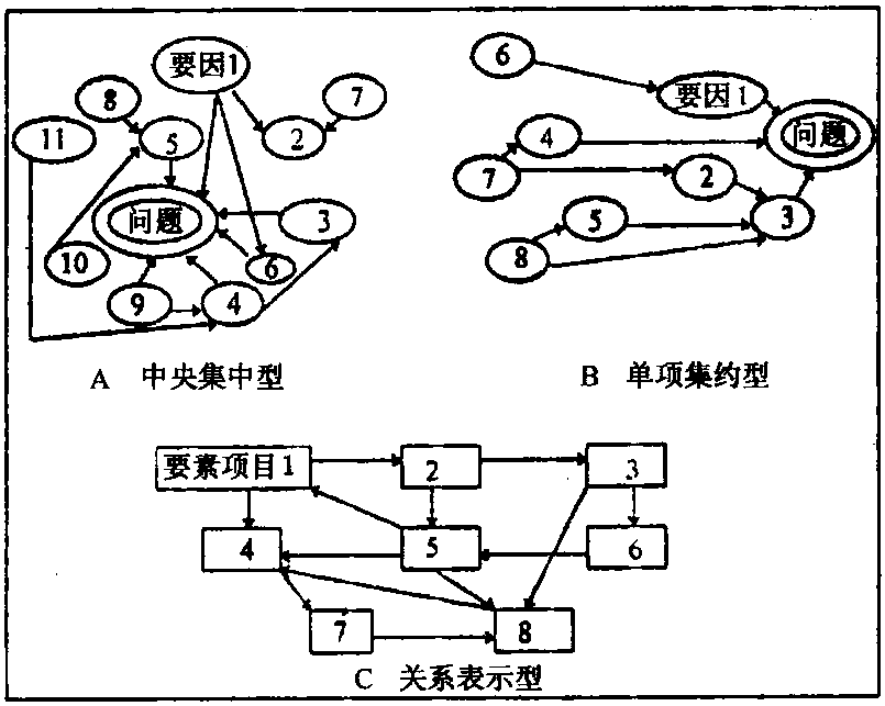 释义 | 关系图 关系图guanxitu表示有限集x到y的二元关系R的平面上的图形.有时,可将R的关系图看作关系R自身. 集x上的二元关系R也可用关系图表示,当 (x,x)∈R时,点x到自身有有向圈,而 (x1,xj) ∈ R且 (xj,xi) ∈ R时,则既有从xi到xj的有向线,又有xj到xi的有向线(按定义,它们是不同的!). 例如,A= {1,2,3,4,5} 上的二元关系R={ (1,1),(2,3),(1 ,2),(2,1),(3,4),(5,5)} 的关系图为 给出关系R,因选取代表元素的点的位置不同,会得到表面形象上不相同的关系图.当然,它们刻划的是同一个关系:不仅点数、边数一样多,并且点之间是否有有向线相联是完全相同的. 由关系R的关系图,将所有有向线改变方向就得到逆关系Rc的关系图. ☚ 关系 关系矩阵 ☛ 关系图 关系图Relationship-Diagram Method用箭头线表示事物之间因果关系的一种连线图(关系图),也称为关联图法。关系图法是一种群体解决问题的方法。确定了所要解决的问题后,要由若干个成员组成一个小组,由全体成员多次反复构画关系图。在这一过程中充分发挥创造性思维,利用关系图明确各种复杂的因素之间的因果关系,小组就问题形成共识,最终找到解决问题的对策。关系图法在质量管理中主要应用于以下一些方面:(1)制定企业开展全面质量管理活动的规划;(2)质量方针的设定与展开;(3)制造过程中的质量改进,特别是提出解决潜在质量问题的对策;(4)推动QC小组活动;(5)解决顾客投诉的问题;(6)改进企业的业务活动;(7)解决在交货期管理、过程管理方面存在的问题。 图9-11 关系图的形式 关系图法的步骤为:(1)提出要达到的目标及所要解决的问题,用◎表示;(2)提出自以为与问题有关的一切主要原因(或达到目标的手段),并用简明而通俗的语言表示出来,用○圈起;(3)用箭头表示出问题与原因之间、主要原因之间、目标与手段之间的逻辑关系,箭头方向通常是由原因指向结果,目标指向手段(根据问题的不同,允许箭头做相反的指向,因此,作关系图时,有必要预先规定好箭头的方向和定义);(4)掌握全貌;(5)进一步归纳出重点项目,在图上可画上阴影线表示强调。 在作图时要注意:(1)要尽可能多地搜集情报,集思广益,重视各方面的意见;(2)尽可能用生动的语言表述原因;(3)由小组成员共同作图;(4)要反复修改,以便归纳出重点项目;(5)对于原因-结果型课题,以“为什么……”为题容易作图,分析不下去时,多问一个“为什么”;(6)能够采取的措施务必立即采取,一旦发现新的事项或原因,立即调查或改变行动;(7)若存在相互关联的环状因素关系,可考虑在某处断开。 ☚ 质量管理新七种工具 KJ法 ☛ |