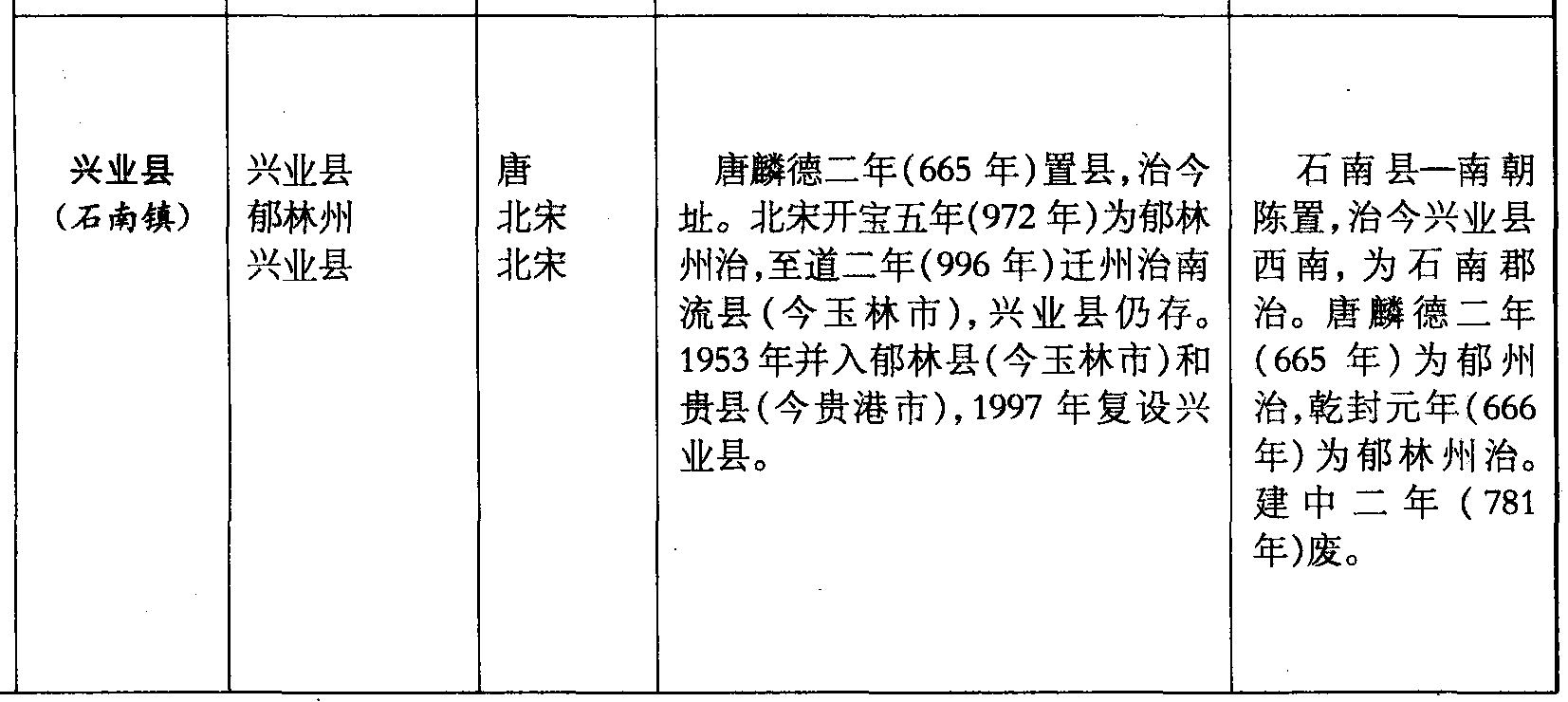 兴业县(石南镇)兴业县郁林州兴业县唐北宋北宋唐麟德二年(665年)置县,治今址。北宋开宝五年(972年)为郁林州治,至道二年(996年)迁州治南流县(今玉林市),兴业县仍存。1953年并入郁林县(今玉林市)和贵县(今贵港市),1997年复设兴业县。石南县—南朝陈置,治今兴业县西南,为石南郡治。唐麟德二年(665年)为郁州治,乾封元年(666年)为郁林州治。建中二年 (781年)废。