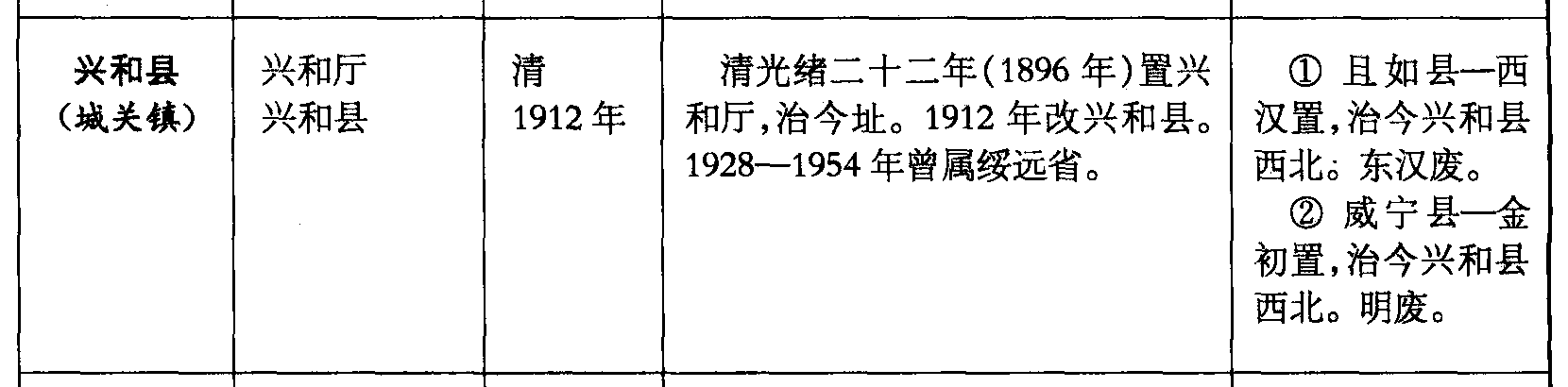 兴和县(城关镇)兴和厅兴和县清1912年清光绪二十二年(1896年)置兴和厅,治今址。1912年改兴和县。1928—1954年曾属绥远省。❶ 且如县—西汉置,治今兴和县西北。东汉废。❷ 威宁县—金初置,治今兴和县西北。明废。