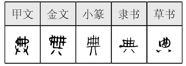 【提示】中间一横宋体与两边相接,楷体与两边相离。 *典diǎn8画 八部 (1) 重要的、其内容被尊为准则或规范的书籍、文献: 经~|法~|字~|引经据~。 (2) 标准;法则: ~范|~章|~型。 (3) 诗文中引用的古代掌故: 用~|出~。 (4) 郑重举行的仪式: ~礼|盛~|开国大~。 (5) 〈书〉主管;主持: ~试官|~狱长。 (6) 以实物抵押,向别人借钱,到期可以赎回: ~借|~押。 典 ☚ 丌 畀 ☛ 典diǎn甲骨文从又(手)或廾(gǒng,双手)持册。周代金文至小篆上从册,下从(“其”的战国写法),象置册在几状物上。 隶楷基本接近册在上的写法。册是书册,汉代以前多用绳穿竹简等成册。多指可以作为标准、典范的书籍。如:典籍|词典|字典。引申为标准,法则。如:典范|典章|典礼。组词如:典型|典故。转义如:典当|典买。 典★常◎常