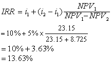 释义 | 内部利率法 内部利率法Internal Return Rate以内部利率为指标的投资方案评价方法。内部利率指使投资的现金流量现值为零的折现率。这是对净现值法的补充,净现值法在使用时须事先指定一个目标收益率或贴现率,而计算的结果只说明了投资项目是否达到或超过这个标准,但却未求出项目实际达到的效率,而且指定一个适当的贴现率很不容易。内部利率法求得的利率是项目实际能达到的投资效率即内部收益率,而不用事先给定贴现率。 例:某项目期初(第1年年初)固定资产投资100万元,投产时需流动资金投资20万元。该项目从第3年初投产并运行,每年需运营费40万元。若项目每年可获销售收入65万元,项目服务年限为10年,预计残值20万元,设折现率为10,求净现值。 先取i2=10%,计算如下: NPV1=-100-20×(P/F,10,2)+(65 -40)×(P/A,10,10)×(P/F,10,2) +(20+20)×(P/F,10,12) =-100-20×0.8264+25 ×6.144×0.8264+40×0.3186 =23.15(万元) 再取i2=15%,计算如下: NPV2=-100-20×(P/A,15,2)+(65 -40)×(P/A,15,10)×(P/F,15,2) +(20+20) ×(P/F,15,12) =-100-20×0.7562+25×5.2337× 0.7562+40×0.1869 =-8.725(万元) 因此: ![]() 即该项目的内部利率为13.63%。 动用内部利率法评价投资方案的规则是,在只有一个备选方案的采纳与否的决策中,如果计算出的内部利率大于或等于资金成本或期望报酬率,就可接受该方案,反之应拒绝。在多个方案中,则应选择内部利率最高的投资方案。 ☚ 年费用法 外部收益率法 ☛ 内部利率法internal rate of return method |