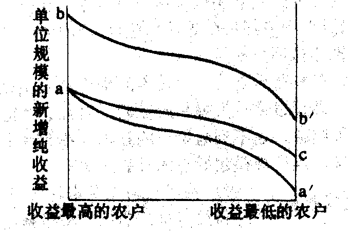 单位规模的新增纯收益分布曲线 同一地区的农户采用同一种新技术后,从单位规模上获得的新增纯收益是不同的,可用图2的新增纯收益分布曲线表示。提高整个分布曲线的位置(从aa′提高到bb′)或提高低收益农户的新增纯收益(从aa′提高到ac)都能增加农户采用新技术后的经济效益。 建立和分析推广速度增长曲线和单位规模的新增纯收益分布曲线,对因地制宜地推广适用的先进技术,找到加速技术推广的有效途径,进而提高农业技术推广的经济效果有着重要意义。 |