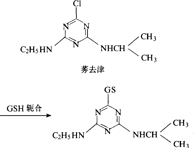 莠去津在植物体内形成的谷胱甘肽(GSH)轭合物 轭合物易分解,所以确定它的结构较为困难。在离体试验中采取温和水解的方法,可使轭合物分解得到原来的母体化合物或代谢物。 |