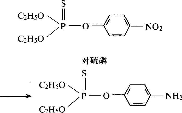 脲的水解 有些类型的农药如有机磷酸酯类水解反应速度较快,所以药效维持较短。农药的水解反应通常为解毒反应,但也有少数例外,如杀虫脒的水解产物4-氯邻甲苯胺具有致癌作用。苯菌灵在植物体内的代谢产物多菌灵是具有杀菌活性的有效成分,这一发现使多菌灵被开发为农药。 还原反应 由还原酶催化的初级代谢。能催化农药发生还原反应的酶种类有限,硝基还原酶(nitroreductase)即属这一类。还原反应在农药的初级代谢中远不如氧化反应和水解反应重要。还原反应通常包括硝基还原为氨基的反应,氢化反应及脱卤反应。如含有硝基苯母核的农药苯硫磷、对硫磷、杀螟硫磷等在反刍动物的胃液中很容易还原为氨基衍生物。当有机磷农药分子中的硝基被还原为氨基后,它们就失去了原有的生物活性与毒性。有机氯农药在动物体内还原脱卤后,一般还须经历羟基化反应、轭合反应等过程后才能从尿中排出。农药还原反应实例如下: