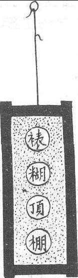 四边为黑色,中间为红色,上用黑色书写“裱糊顶棚”四个字,表示铺内出售办丧事用的,纸糊成的车、人、马、船等,并兼营表糊顶棚。过去东北各地皆有,现已不用此幌。