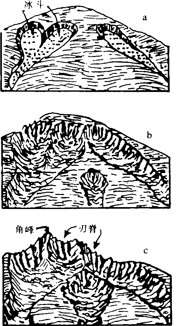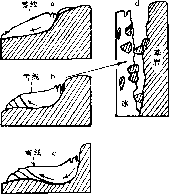 释义 | 冰蚀地貌 冰蚀地貌bingshi dimao由冰川侵蚀作用形成的地貌形态。山岳冰川在雪线附近及其以上部位有冰斗、刃脊和角峰;雪线以下有冰川槽谷,在槽谷中有时发育羊背石。大陆冰川有羊背石、冰蚀湖和峡湾等形态。 图1 冰斗冰川的刨蚀和掘蚀 a、b、c.冰斗因旋转运动刨蚀成冰盆;d. 背隙掘蚀作用 在高纬地区,大陆冰川和岛状冰盖有很厚的冰体,在自重的压力下,从冰川中心向四周呈放射状流动。当冰体流动时对地表进行破坏,形成冰蚀地貌形态。 ❶峡湾:大陆冰川或岛状冰盖伸入海洋时,因冰体很厚,当未破裂漂离之前,对岸边侵蚀成一些很深的槽谷,冰退以后,槽谷被海水淹没形成与海相通的狭窄海湾。其形态特征是深入陆地,宽度小,长度大,岸壁陡峭,海水较深,水下有陡坎和冰川作用的痕迹,以挪威西海岸最为典型。 ❷冰蚀湖:是冰川侵蚀作用形成的湖泊。冰川在重力和压力作用下,冰川流动时将地面挖掘成洼地或将原来洼地改造成湖盆,冰融后积水成湖。冰蚀湖是大陆冰川地区较典型的冰蚀地貌形态,北欧、北美地区不少湖泊是属于冰蚀湖类型。 ❸鲸背石、石鼓丘:在大陆冰川地区最常见。在冰川基床上有由基岩组成的小丘,经冰流的磨蚀作用形成迎冰面缓、呈流线型,而背冰面陡、呈锯齿状的椭圆形小丘,因常成群分布,犹如匐伏的羊群,称为羊背石。鲸背石是迎冰面与背冰面均呈流线型,是在较暖冰下多水的条件下形成的。石鼓丘是全部由基岩组成,其特征是迎冰面比背冰面陡峭。 图2 冰斗、刃脊和角峰的发育 ☚ 冰川地貌 冰碛地貌 ☛ 冰蚀地貌由冰川侵蚀作用所形成的各种地貌,包括冰斗、冰川谷、刃脊和角峰等。 |