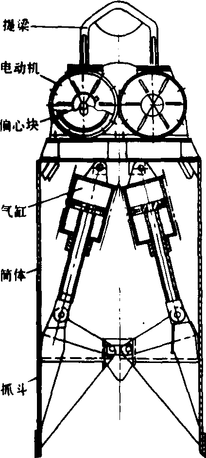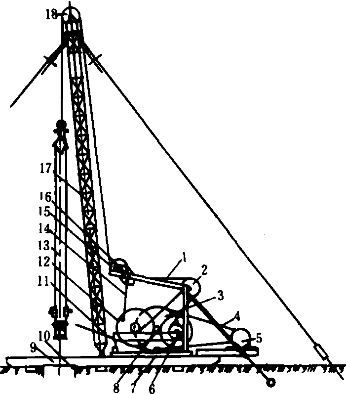 释义 | 冲击式钻机percussion drilling machine靠钻具的垂直往复运动冲击破碎地层凿井的水井钻机。按其结构形式不同,有钢丝绳冲击式钻机和潜孔振动冲抓锥。 图1 冲击式钻机 1.主钢丝绳; 2.游轮; 3.大胶带轮; 4.胶带; 5.电动机; 6.工具卷筒; 7.机架; 8.主轴; 9.机台木; 10.井筒; 11.操作手把; 12.冲击齿轮; 13.钻具; 14.连杆;15.冲击轮; 16.冲击梁; 17.桅杆; 18.天车 冲击机构主要由冲击齿轮曲柄连杆机构及冲击梁组成。冲击齿轮上有5个偏心的曲柄销孔,通过改变曲柄销的位置可以得到不同的冲程(每次冲击时钻具下落的距离);冲击梁由压绳滑轮、导向滑轮、游轮轴组成。冲程由钻具的质量、工作深度及所需的时间确定。通常取0.5~1米;冲击频率即每分钟钻具冲击次数,取决于钻具下落时曲柄旋转角、钻具在井孔中下落加速度和冲程,常用频率为30~50次/分。由于钻进时遇到阻力,钻具下落加速度要比重力加速度降低30%,一般软岩层为4.5~5米/秒2,硬岩层为6~6.5米/秒2。 冲击钻具有两种类型,一种是将钻头和钻杆固定在一起,用于凿进。而另设抽砂筒(底部有止逆阀的圆柱形筒),换装后用来清除井底岩屑。这种钻具的钻杆为圆钢,按井的规格不同而取不同尺寸,一般长为2~6米,直径为112~188毫米,重量为145~704千克,其钻头的结构形式有补焊一字形钻头(刃口为一字形)和十字形钻头(刃口带副刃呈十字形);为增强钻头耐磨性,提高钻进速度,常采用钨钢粉补焊钻头刃口部。另一种是抽砂筒钻头,即把钻头和抽砂筒直接连接起来,边冲击凿进,边装砂,装满后抽出井外,适用于松散地层的钻进。抽砂筒的筒壁有6~10条轴向肋骨,以减少提升时的阻力;有的在抽砂筒底部加上环刃,用于松散砂砾层钻井。 潜孔振动冲抓锥 一种放入井孔内的电动机和钻具连成一体,靠振动、冲击作用破碎岩层的钻机。一般作为一种附件与有提升装置的机械组合起来使用,其结构如图2。工作时,两台电动机分别带动其轴上的偏心块作相反方向旋转。在起动后一个很短暂时间内,由于质量守恒原理,两台电动机能自动同步反向回转,从而产生上下方向的简谐振动,带动筒体一起上下振动,当筒体向下运动时,抓斗在振动冲击作用下靠其环形刃口在直径1米的圆周上切入地层;当沉入到一定深度后即开动气缸推动两个抓斗合拢,将岩屑抓入筒中,提出井口后张开抓斗放出岩屑。这种钻机结构比较简单紧凑,适用于粘土或较松散地层钻凿大口径的水井,钻进效率也较高,但井深加大时效率显著下降,钻直径1~1.2米、深40~50米的水井时,钻进效率为1.6米/小时。 图2 潜孔振动冲抓锥 冲击式钻机pound drilling rig使工作部件作往复运动的一种钻井机械。由钻具、钻架、动力及传动装置等组成。工作时,由电动机通过传动机构使钻具上的钻头作上下往复运动。当向下运动时,由于钻具的重量产生冲击力使钻头破碎地层,再用抽砂筒将岩屑、泥沙、卵石等抽出井外。这种钻机结构简单,容易制造,但随着钻井深度增加,井内阻力增大,钻进效率降低,钻井深度一般在250 m以内。 冲击式钻机attack drill |