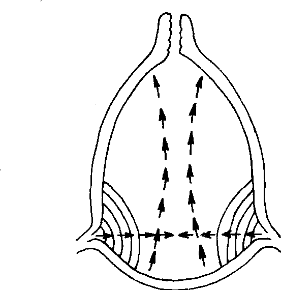 ❷对称性及极性即宫缩起自两侧子宫角部,以微波形式迅速向子宫底中线集中,左右对称;然后很快向子宫下段扩散。这是子宫收缩的对称性。子宫收缩力以子宫的底部最强,向下逐渐减弱。这是子宫收缩的积极性(见图6.5-4)。
