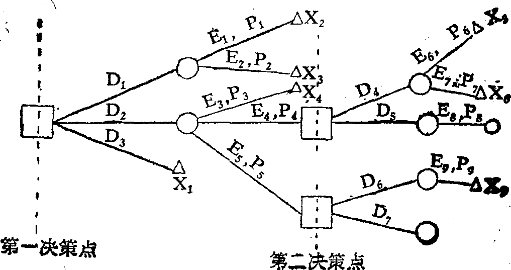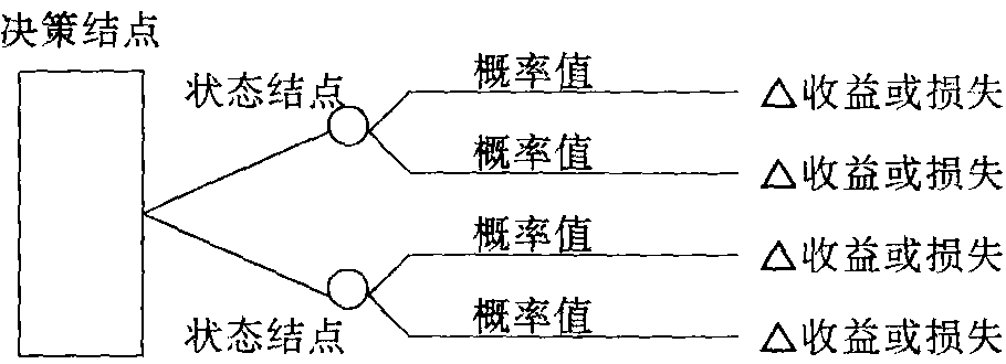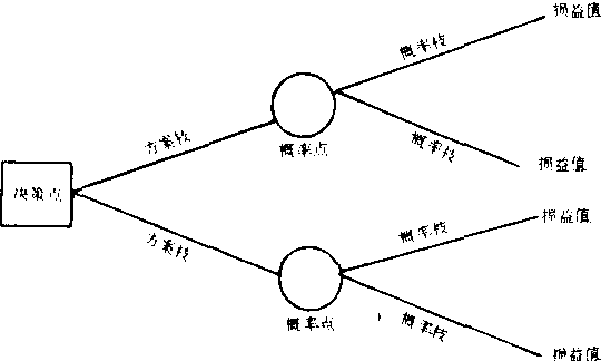 点2:0.7×100×10年+0.3×(-20)×10年-300(大厂的投资数)=340万元。 点3:0.7×40×10年+0.3×10×10年-160(小厂的投资数)=150万元。 两者相比,建大厂的方案最优。 决策树见“决策学”中的“决策树”。 决策树见“决策学”中的“决策树”。 决策树 决策树决策树是决策术中的一种。其方法是将方案的一连串因素,按他们的相互关系,用树形图表示出来,再按决策的原则和程序进行选优决策。决策树模型用下列三种符号表示:“口”表示决策结点,从结点可以划出树形支线。“O”表示决策变点,变点也就是改变结点,使结点延伸到树形的下一层次。“△”表示决策终点,即方案中的这一因素到此终结,不能再划出支线。通过这些符号,将方案的情况绘制成树形图,然后再通过数计算,比较各种方案的优劣及时找到决策的答案。决策树能使问题形象化,各种更替方案、各种出现的状态、其可能性大小及产生的后果,都可绘制在一张图表上,一目了然,对集体讨论决策提供了很大方便。 ☚ 决策矩阵 预测与决策 ☛ 决策树 决策树决策树是决策术中的一种。其方法是将方案的一连串因素,按它们的相互关系,用树形图表示出来,再按决策的原则和程序进行选优决策。决策树模型用下列三种符号表示:“口”表示决策结点,从结点可以划出树形支线。“0”表示决策变点,变点也就是改变结点,使结点延伸到树形的下一层次。“△”表示决策终点,即方案中的这一因素到此终结,不能再划出支线。通过这些符号,将方案的情况绘制成树形图,然后再通过数计算,比较各种方案的优劣及时找到决策的答案。决策树能使问题形象化,各种更替方案、各种出现的状态、其可能性大小及产生的后果,都可绘制在一张图表上,一目了然,对集体讨论决策提供了很大方便。 ☚ 决策矩阵 预测与决策 ☛ 决策树是一种向决策人提供关于系列性的决策问题的情报和数据的图形,因其形状如树,故称为决策树。所谓系列性决策问题,是指在原始决策问题之后,还要结合考虑后继的决策问题。决策树的一般形状如下图: 结点□,称为决策点。由此引出的分枝称为方案分枝,表示决策人面临的各种行动方案,如图中Di所示。 结点○,称为机会点,表示自然状态或事件。由机会点引出的分枝称为概率分枝,如图中的事件Ei的概率为Pi,一个机会引出的各分枝的概率之和等于1。 X,为行动方案的实施效果(即行动方案与事件相结合所得的结局),它可以进行预测。这是决策树的终端点,用符号△表示。用决策树求解的顺序是从右向左,依次地解各个结点,直到返回原始点为止。其步骤为: (1)根据问题的性质及搜集的数据作图; (2)预测各种结局的条件盈亏值; (3)预测各种自然状态出现的概率; (4)计算各行动方案的期望值; (5)以期望值为衡量标准,作出决策建议。 决策树在风险型决策中,处理多阶段、多层次、多种可能性问题的一种树形图。参见“决策树法”。 决策树 决策树以决策结点、状态结点和连线组成的,表示单阶段和多阶段决策的树状结构图。树,是图论中的概念,是特殊的图。图中任意两点都有通路的为连通图,非连通无回路的图为树图。决策树,即决策的树图。如图示: □表示决策结点,由决策结点引出的每个“树枝”代表一个方案,称方案枝。○表示状态结点,由状态结点引出的每个“树枝”表示一个自然状态,包括状态变量,变量用概率表示的为概率枝。△表示决策终点,在△处标明每一状态下的益、损值。方案枝、状态结点、概率枝可为n个。决策树有单阶段决策树和多阶段决策树。决策树制图由左向右展开。计算期望值与选择方案由右至左,将计算结果记在各“树枝”上,然后比较期望值,选择期望值大的为最佳方案。决策树方法是本世纪60年代初提出的。企业用决策树分析各种价值为价值树。非定量决策也可用决策树示意。新闻宣传中关于重大报道的计划、方案也可用决策树表示。 ☚ 决策论 两大交流系统 ☛ 决策树 决策树decision tree在决策理论中,有一种借助于图形来进行决策分析的方法。由于这类图形状如树枝,因此称为决策树,这种形式的决策方法也得名为决策树法。决策树由决策点、方案点、树枝和树梢4部分构成。决策点引出方案分枝,其分枝数反映可能采取的行动方案数;方案点引出概率分枝,其分枝数反映可能出现的自然状态数;在树枝与树梢上标明概率和收益(亏损)值。 ☚ 确实等值调整因子 模拟 ☛ 决策树 决策树用树形图来表达的决策分析图解工具。构成决策树的基本要素有: (1) 决策点。用“□”表示,表明决策的目标和最后决策的结果。(2) 状态结点。用“○”表示,表明某一方案在各种自然状态下所能获得的效果。(3) 方案枝。用由决策点引出而以状态结点为终点的直线表示,每一条直线表示一个方案。(4) 概率枝。由状态结点引出的直线表示,每一条直线表示一种自然状态。决策树广泛应用于风险型决策问题。其作用是: (1) 把一个具有风险型的决策问题通过图示方式展开,可使决策者直观地看出统一整体的内在联系,便于决策者统观全局来分析和解决问题。(2) 各种方案的有关条件及未来发生的状态都一目了然,方案的优劣能明确直观显示出来。(3) 特别适用于表达序贯决策,进行动态分析,便于清晰简捷地完成一个复杂的多级决策问题。其应用步骤如下: (1) 按实际决策问题绘制树形图。绘图顺序是从