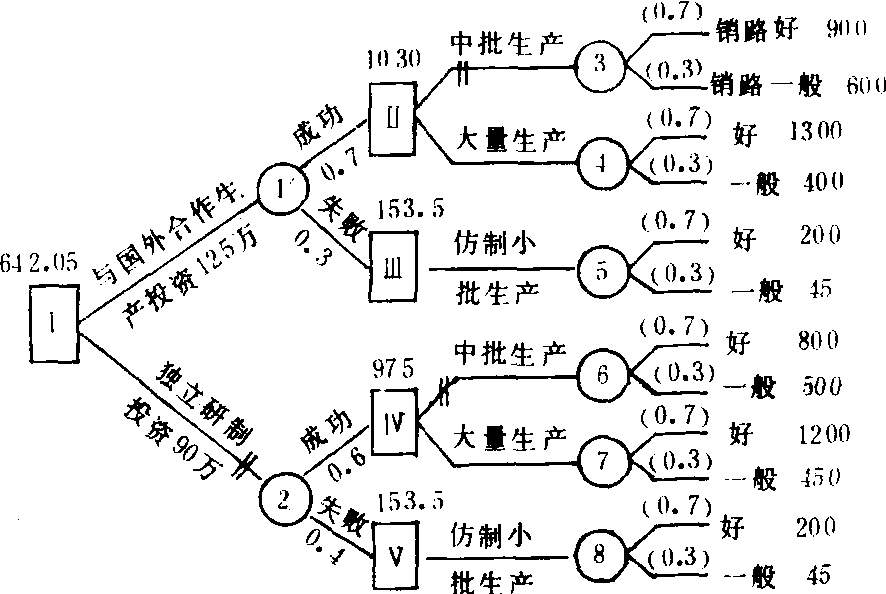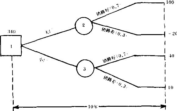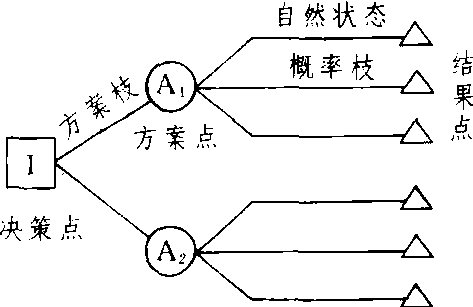 释义 | 决策树juécèshù根据各种可能设计多种方案,以比较选择从而提高决策效果的一种方法。例如:“现代化决策方案的拟定,要用科学的方法。一般常用的是‘决策树’等方法。‘决策树’,是指有不同种方案,每种方案又会有几种可能出现的情况,因而会产生各种不同的决策效果。就像一棵树生出几个树杈,每个树杈又生出几个枝梢一样。运用此法,可以使决策人员以科学的推理步骤去周密思考各有关因素,把未来的可能发生的事件展开,比较事件发展动态,通过数字计算,使方案更加接近实际。”(《经济日报》1983.8.6) 决策树decision tree表示决策方案与有关因素之间相互关系的由左向右横向展开的树形图。通过计算,可以在图上进行决策,决策树的基本图形如右。决策树图画成后,可从结果点开始,从右向左顺序计算出各个方案的损益期望值〔即∑(结果点损益值X概率)〕,写在方案点上方。比较各方案期望值的大小,从中选出最佳方案,并将其期望值写在决策点上方,表示决策结果。同时在淘汰方案的方案枝上划上双截线(艹),表示剪去不用。如决策问题属多阶段的,可从右向左逐步剪枝。决策树方法比较直观灵活,便于决策者集体讨论研究,广泛应用于多阶段动态决策。 决策树一种可用于决策问题的决策图。因其形似树而得名。由决策点、方案枝、概率点、概率枝顺序延长而成。最右端是损益值。决策时,从右至左,先算出各概率点的损益期望值,标在各概率点上。再比较各损益期望值的大小,选出最优方案,并把最优方案的损益期望值注在该决策点上,在舍弃的方案枝上划“艹”,决策问题就告结束。如是多阶段决策问题,则按此步骤,继续进行决策。 例如:为生产某产品而设计了两个基建方案,一是建设大厂需投资300万元。一是建设小厂需投资160万元。两厂的使用期均为10年,估计在此期间,产品销路好的可能性是0.7,销路差的可能性是0.3,两个方案的年度损益值如下表:
