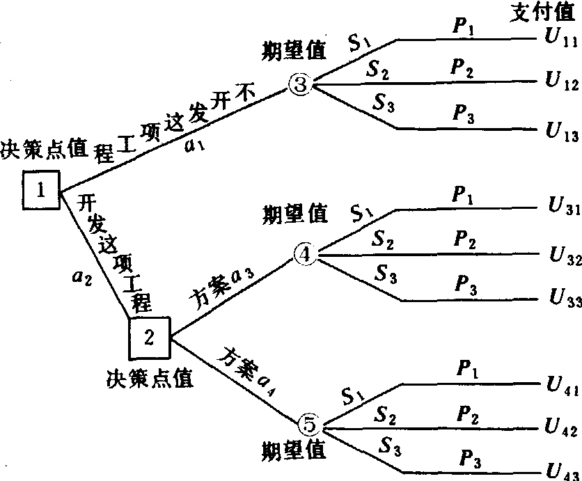 表中包括备选方案ai、自然状态Sj、自然状态的概率Pj和支付值Uj四项要素。备选方案是决策者可以控制的因素,称为决策变量。自然状态是不可控变量。可以是经济状况、天气情况或决策者不能控制的其他环境条件。自然状态概率也是不可控变量。各自然状态的概率之和必等于1。支付值Uij是结果变量,表示第i种方案在第j种自然状态下的支付值。它们可用货币量或其他物理量,如天数、小时数等计量,还可用效用值表示。效用值是决策者对决策后果偏好的尺度。效用值由效用函数给出。决策者偏好决定了效用函数的类型。例如,对于一个敢冒风险的决策者,他对获利较大但风险也较大的策略给予较大的效用值,而对获利较小,但比较有把握的策略给予较小的效用值。其效用函数是凹的。对于一个持稳重态度的决策者来说,则常常采取比较稳妥的策略,提高获利较小而把握较大的策略的效用值,降低获利较大但风险也较大的策略的效用值,其效用函数是凸的。 对于多层次的决策过程,可用决策树表示。其结构如下图。图中□为决策点,○为机会点,——为支。S1为旱年、P1为出现旱年的概率;S2为正常年,P2为出现正常年的概率;S3为涝年,P3为出现涝年的概率。