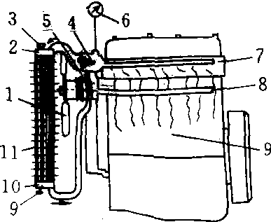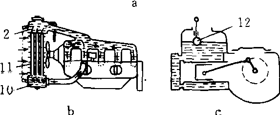 释义 | 冷却系统cooling system又称散热系统。用以冷却内燃机,使其保持正常工作温度(85~90℃)的装置。按冷却介质不同,分为水冷和风冷两类;按冷却水循环方式,又可分为压力循环式、自然循环式和蒸发式3种。自然循环借水的对流实现冷却。水套中的水由于接触高温零件温度升高,热水因密度减小而上升,经散热器冷却后因密度增大而下降,在散热器上、下水箱间形成压力差,使冷却水连续不断地循环。压力循环是由水泵迫使冷却水进行循环,由水泵、风扇、散热器、节温器、保温帘等组成。内燃机工作时,水泵从散热器下部吸入低温的水.以一定压力送入内燃机冷却水套中,水吸收热量后水温上升,最后经节温器及上水管流回散热器。节温器根据循环水的温度控制通过散热器冷却水的流量。蒸发式冷却是利用沸水蒸发冷却内燃机,蒸发水箱直接与缸体水套相连,并与大气相通。当冷却水沸腾蒸发时,即将随蒸汽所带走的热量散发到大气中。多用于小型内燃机。风冷系统结构简单,通常由轴流式风扇、散热片、导流罩等组成。散热片与汽缸体和汽缸盖铸成一体。内燃机工作时,风扇产生的气流经导流罩(多缸内燃机还有分流板)吹向内燃机,将热量带走。 水冷却系简图 a. 压力循环式 b. 自然循环式 c. 蒸发式 1.风扇 2.上水箱 3.空气—蒸气阀 4. 节温器 5.水泵 6.水温表 7. 水套 8.分水管 9.放水阀 10.下水箱 11. 散热器 12. 浮子 冷却系统给空气调节提供冷空气的系统,或以水和其他液体作冷却剂的系统。 冷却系统cooling system |