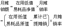 这种方法一般适用于低值易耗品种类较多、领用频繁的情况。其核算处理: 领用时按领用的全部原值借记“低值易耗品——在用低值易耗品”,贷记“低值易耗品——在库低值易耗品”; 每月月末按以月摊销率计算的摊销额借记有关费用或成本帐户,贷记“低值易耗品——低值易耗品摊销”; 报废时,借记“低值易耗品——低值易耗品摊销”,贷记“低值易耗品——在用低值易耗品”对冲。由于是按全部在用低值易耗品净值计算摊销额,故报废时则可按其原值冲销累计的摊销额,而不考虑个别低值易耗品的实际摊销数。