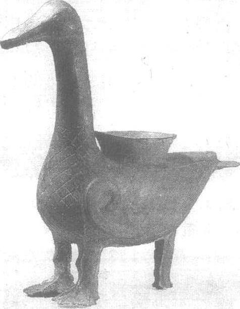 释义 | 凫铜尊 凫铜尊西周。高44.6厘米,长41.9厘米。1955年辽宁省喀左马厂沟出土。北京中国历史博物馆藏。尊,古代酒器。此尊通体作鸭形。背有尊口,外侈与常见圆尊同,胸部有斜方格纹,线刻两翼,并有突起的前缘。后端下有一支柱。此尊为西周早期遗物。 ☚ 铜弓形器 “小臣宅”铜簋 ☛ |