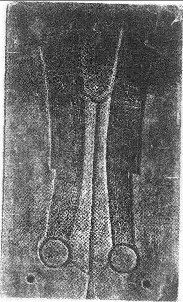 释义 | 刀币石范战国 (约公元前348—284)齐国刀币石范,长21.5,宽12.5,厚2.7厘米。存有阴刻平行线模2枚。左枚为面模,刀身部有阴刻反书“莭墨之大化”5字;右为背模,上部阴刻“≡”三横道,其下阴刻反书“辟邦”2字。两钱模均长17.8,宽3厘米。刀柄部均有阴刻平行线两条。石范上部浇铸口宽1.4,道长14,宽0.4厘米,位于两钱模之间,有支槽与钱模相通。两刀头尖,两刀柄下共有3个小凹坑,铸造时用以对准上下范位置。“莭墨之大化”齐易刀留世无多,而此范愈显珍稀。旅顺博物馆收藏。 刀币石范 |