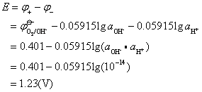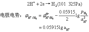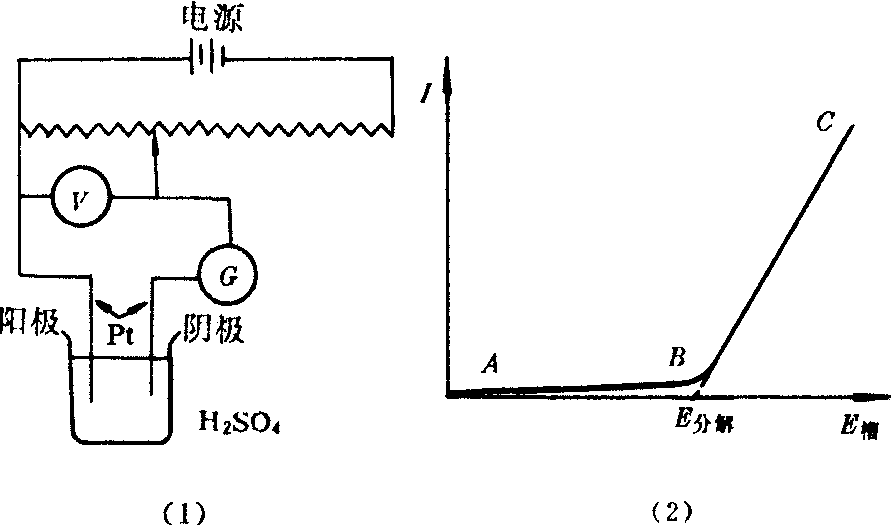 释义 | 分解电压 分解电压fenjie dianya使某电解质溶液继续不断发生电解所需的最小外加电压称为该电解质的分解电压。例如,用铂电极电解0.5mol·L-1H2SO4溶液(见图(1)),当外加电压逐渐增加时,通过电解池的电流也略有增加。但只有电压增到1.67V(图(2)中的E分)时,电流才随电压迅速上升,同时两极连续不断析出氢气和氧气。1.67V就是电解0.5mol·L-1H2SO4的分解电压,也叫实际分解电压,它大于理论分解电压(1.23V)。 (1)分解电压的测定 (2)测定分解电压时的电流-电压曲线理论分解电压则是电解进行时,由析出物质构成的电池的可逆电动势。例如,电解硫酸溶液时,电解池阴极(负极)析出H2 ![]() ![]() 1.23V就是电解硫酸溶液时的理论分解电压(E理)。一些物质的实际分解电压E实和理论分解电压E理,见表。E实>E理,这是由电解时电极极化造成的。1mol·L-1电解质的分解电压 铂电极