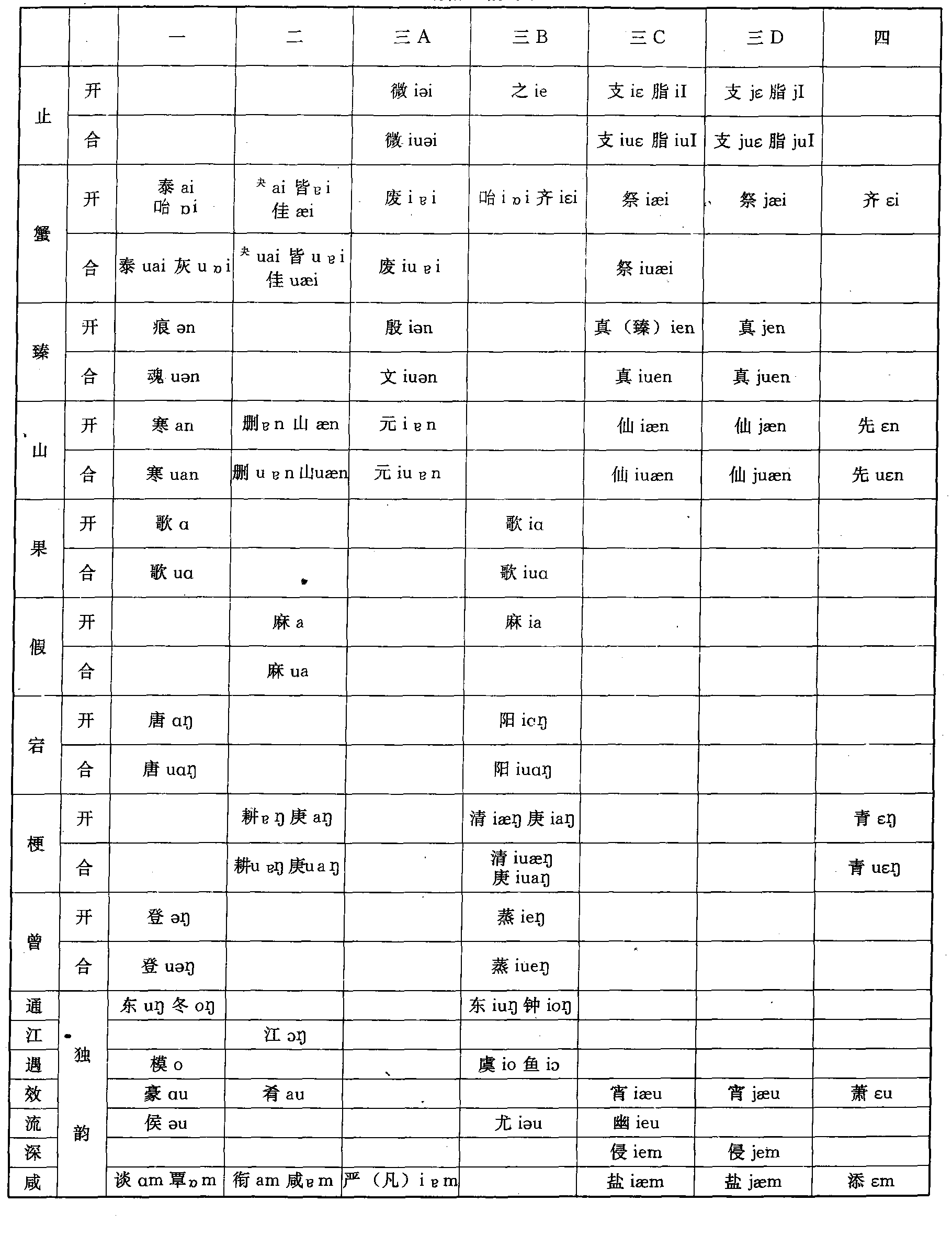 释义 | 切韵指南 切韵指南全名《经史正音切韵指南》。元刘鑑著。一卷。是书以司马光之《切韵指掌图》为粉本,而参用《四声等子》,增以《格子门法》。切韵之学,大备于司马光和刘鑑之书。 ☚ 切韵指掌图 韵学源流 ☛ 《切韵指南》全名为 《经史正音切韵指南》,元代刘鉴著。 至元二年 (1336年) 写成。 此书在体式上参用 《四声等子》与 《切韵指掌图》 的做法, 也分十六摄, 并注内外, 这与 《等子》 一致。 但多出四图。 在列字上, 也与 《等子》 比较接近。 元代实际语音已经不同于宋代, 《指南》卷首依然 “分五音”、“辨清浊”,其实这时 “五音”有的已消失, 许多全浊声母也已变为清音,这是其泥守传统之处。卷首的歌诀中说: “知照非敷递互通,泥娘穿彻用时同,澄床疑喻相连属,六母交参一处穷。”这表明了当时知照两系的合并,非敷的合并,疑母[]声母的消失。这些语音演变的实际情形, 韵图本身并未能表现出来。 由此可知, 《指南》是有其保守性的。 《切韵》韵母表 切韵指南 切韵指南音韵学书名。全称《经史正音切韵指南》。元刘鉴撰。成书于元至元二年(1336年)。分为十六摄二十四图,比《四声等子》多四图,各摄排列次序是:通、江、止、遇、蟹、臻、山、效、果(假)、宕、梗、曾、流、深、咸。每图横列二十三行,以统括三十六字母。从形式上看《切韵指南》和《四声等子》不同,就是《切韵指南》不附“江”于“宕”,不附“梗”于“曾”。而且把梗摄、咸摄分为开合两图。但在实际处理上,两者比较一致。熊泽民《切韵指南·序》说:“古有《四声等子》,为流传之正宗。”刘鉴在自序中说他的书是“因其旧制,次成十六通摄”,这个“旧制”可能也是指《四声等子》。《切韵指南》很可能就是根据《四声等子》的旧制,配上《五音集韵》的韵字,编制而成的。 ☚ 切韵指掌图 经史正音切韵指南 ☛ 切韵指南全称《经史正音切韵指南》。等韵学书。元·刘鉴著。在《四声等子》基础上变革而成。分为十六摄二十四图,比《四声等子》多四图,即将江摄从宕摄中独立出来,立为“江摄外一”;将梗摄从曾摄中独立出来,立为“梗摄外七开口呼”、“梗摄外七合口呼”两图;将《四声等子》只有一图的咸摄分为两图。每图纵列二十三行以统括三十六字母,与《韵镜》相同。并涉及了声调方面浊上变去的问题。是研究宋元语音变化的重要参考书。 切韵指南 切韵指南全称《经史正音切韵指南》。(元)刘鉴著。取金韩道昭《五音集韵》字,参以《四声等子》体例,列十六摄24图,每图横列三十六字母,纵列平、上、去、入四声,每声分四等。是研究宋元间语音变化的重要资料。 ☚ 切韵考 切韵指掌图 ☛ 切韵指南见“经史正音切韵指南”。 |