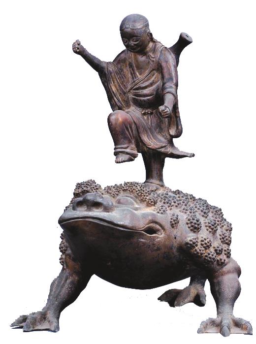 铜器。国家一级文物。高41.5 厘米,宽 36 厘米,重达 12 公斤。下部为一只三足蟾蜍,蟾蜍阔口隆鼻,暴突眼,浑身凸起稣瘤。上部刘海身背葫芦形酒壶,一手握拳上举,一腿提悬,一脚踩于蜗蜍背上,身体微微前倾,作戏弄蟾蜍之状。现藏天水市博物馆。