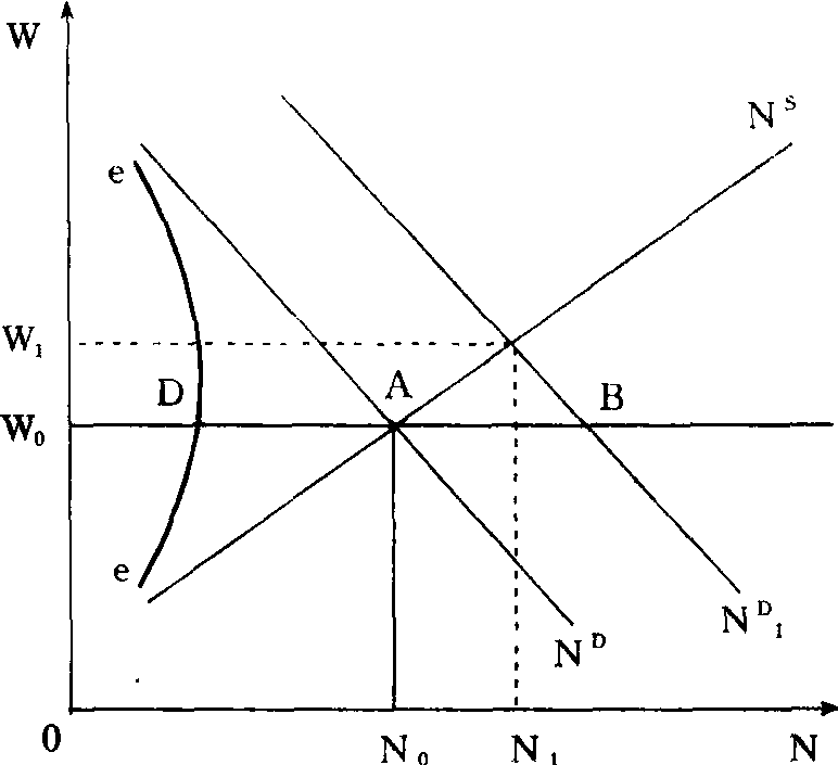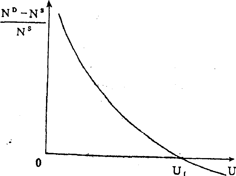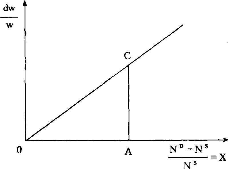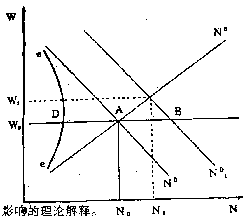 释义 | 利普西过度需求模型R·G·利普西对菲利普斯曲线进行理论论证的经济模型。认为菲利普斯当初提出时,仅代表了一种经验关系,缺乏严格的理论证明,利普西的过度需求模型,为这种关系作出了最有影响的理论解释。 利普西首先考察了一个微观劳动力市场中的工资率的变动,接着把微观劳动力市场加以总合而推导出货币工资和失业之间的宏观经济关系。在他的模型中,微观劳动力市场的特征是: 劳动力的流动性在市场内部比在各市场之间要大; 劳动的供给和需求曲线被画成货币工资的函数 (而不是实际工资的函数,其暗含的假设是其他部门的价格和工资即定不变。如图所示。劳动力需求ND和劳动力供给是货币工资率的线性函数,A (W0,N0) 点为ND与NS的均衡点,且当ND =NS时,货币工资的变化率被假定为零。模型中劳动力需求与供给是指在任一货币工资率W下计划的劳动需求和计划的劳动供给。 劳动力供给NS由已受雇劳动力N和未受雇劳动力U组成,则有: 劳动力需求ND由已受雇劳动力N和职位空缺V组成,则有: 劳动力过度需求X等于职位空缺数和失业人数的差 (公式(3));从劳动力供给方看,过度需求X/NS=x是职位空缺率V和失业率U差之(公式(4)): 因此,不能从劳动力市场无过度需求ND=NS,就立即得出无人失业的结论。均衡点A只隐含职位空缺V的数目等于寻找职业的人数U,即存在摩擦失业的情况。于是曲线ee是实际就业的边界线,DA是度量摩擦性失业的均衡水平和空缺职位的均衡水平 (在X-U函数中,这一均衡水平用Uf来表示)。可以证明,空缺职位与失业率间具有一种稳定的逆向联系,失业率成为过度需求的理想替代指标。据此利普西得到X-U曲线,并完成工资调整函数与X-U函数的结合,从而推导出菲利普斯曲线。具体而言: 利普西采用的是新古典的工资调整函数,即劳动力超额需求和货币工资变动之间的正向关系。简单明了的工资调整函数公式是 ![]() 在下图中,劳动力的超额需求引起货币工资的相对变化AC。这一关系也可由图16-38说明,当劳动力需求由ND上升到ND1时,在现时货币工资率W0上会出现劳动的超额需求AB,货币工资率在新的均衡点会上升到W1。于是,可以用对货币工资率变化的观察来代替对ND-NS的差的观察。 下图所示为利普西的X-U函数。超额需求的增加会使失业率U下降,超额供给的增加会使失业率上升。Uf是既定的摩擦失业水准。既使出现高超额需求率失业率U也不会是零,结合ee曲线,Uf左侧的曲线渐近地接近纵轴。 当将工资调整函数和X-U函数结合在一起时,单个劳动力市场的菲利普斯曲线就产生了。如果工资调整函数中dw/w和(ND-NS)/NS之间的正向关系已知,那么用dw/w代替上图的超额需求,就能得到单个劳动力市场的菲利普斯曲线,见下图。整个劳动力市场的宏观菲利普斯曲线可以由单个函数加总获得。失业和职位空缺在单个劳动力市场间的分布,决定着宏观菲利普斯曲线的位置,分布的不均等程度越大,曲线向右方移动越大。这一论点的内在含义是: 通过降低失业的离散程度是可能在不提高通货膨胀的前提下减少总失业,地区性政策、行业干预政策和鼓励各劳动力市场工人流动的各项政策可以在这找到理论支持。 利普西过度需求模型 利普西过度需求模型excess demand model of LipseyR.G·利普西对菲利普斯曲线进行理论论证的经济模型。认为菲利普斯当初提出时,仅代表了一种经验关系,缺乏严格的理论证明,利普西的过度需求模型,为这种关系作出了最有影响的理论解释。 图16-38 利普西首先考察了一个微观劳动力市场中的工资率的变动,接着把微观劳动力市场加以总合而推导出货币工资和失业之间的宏观经济关系。在他的模型中,微观劳动力市场的特征是:劳动力的流动性在市场内部比在各市场之间要大;劳动的供给和需求曲线被画成货币工资的函数(而不是实际工资的函数),其暗含的假设是其他部门的价格和工资即定不变。如图16-38所示。劳动力需求ND和劳动力供给是货币工资率的线性函数,A(W0,N0)点为ND与NS的均衡点,且当ND=NS时,货币工资的变化率被假定为零。模型中劳动力需求与供给是指在任一货币工资率W下计划的劳动需求和计划的劳动供给。 劳动力供给NS由己受雇劳动力N和未受雇劳动力U组成,则有: NS=N+U (1) 劳动力需求ND由己受雇劳动力N和职位空缺V组成,则有: ND=N+V (2) 劳动力过度需求X等于职位空缺数和失业人数的差(公式(3));从劳动力供给方看,过度需求X/NS=x是职位空缺率V和失业率U差之(公式(4)): ![]() 因此,不能从劳动力市场无过度需求ND= NS,就立即得出无人失业的结论。均衡点A只隐含职位空缺V的数目等于寻找职业的人数U,即存在摩擦失业的情况。于是曲线ee是实际就业的边界线,DA是度量摩擦性失业的均衡水平和空缺职位的均衡水平(在X-U函数中,这一均衡水平用Uf来表示)。可以证明,空缺职位与失业率间具有一种稳定的逆向联系,失业率成为过度需求的理想替代指标。据此利普西得到X-U曲线,并完成工资调整函数与X-U函数的结合,从而推导出菲利普斯曲线。具体而言: 利普西采用的是新古典的工资调整函数,即劳动力超额需求和货币工资变动之间的正向关系。简单明了的工资调整函数公式是w=dw/w=k·〔(ND-NS)/NS〕,货币工资率的变化同劳动力的超额需求成比例。 图16-39 在图16-39中,劳动力的超额需求引起货币工资的相对变化AC。这一关系也可由图16-38说明,当劳动力
