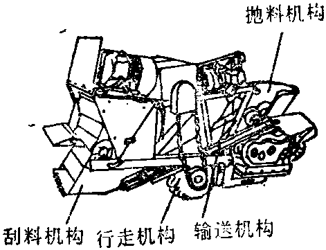 由取料、输送,抛料、行走四个机构组成的清舱专用机械。各机构分别由电动机驱动。工作时,物料被由若干叶片组成的取料机构刮入输送机后,经抛料机构将其抛射到所需位置堆集起来。行走机构用以保证刮抛机可到达舱内任意位置上进行连续不断的刮抛作业。如图示。