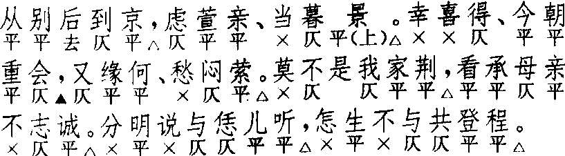 释义 | 刮鼓令 刮鼓令柯丹邱 《荆钗记》 ![]() 全曲八句:5△,6△。7▲,6△。5△,7△。7△,7△。第一句本上三下二句式,但多有作普通五字句者。第三句亦多改作普通七字句。第六句末三字亦可作平平仄;又可作上四下四式八字句,如《红拂记·华夷一统》四支:“开缄喜闻陈姨相傍”、“归心大动终宵怏怏”、“今朝喜闻功成平壤”、“今朝喜与故人相向”。〔刮鼓令〕叠用四支,或三支、二支成套,用在一出戏的中部或后部,亦有前加引子用在一出戏开头。早见于南戏《张协状元》及《小孙屠》,大致相同。以〔刮鼓令〕为主的集曲有〔罗鼓令〕二体,见《南词新谱》。 ☚ 香柳娘 大迓鼓 ☛ |