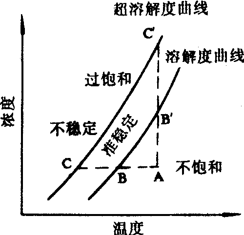 实验原理: 晶体由溶液中析出,有两种方法。在图1中,BB’表示溶解度曲线,曲线下方表示不饱和区域,上方表示过饱和区域。现从不饱和区处于A状态的某溶液出发,使之析出晶体的方法有两种: 一种是A→B的途径,即保持一定浓度,采取降温冷却法; 另一种是A→B’的途径,即保持一定温度,采取增加浓度的蒸发法。通过这些方法,使溶液的状态由不饱和进入过饱和区域从而产生晶核,长大成晶体。但是,过饱和有限度,当达到某一限度 (图1中C—C’即表示过饱和的限度,称为过饱和曲线),则稍有碰击,就会有很多新的晶体析出,不能长成大晶体。为使单晶长大,应使溶液状态保持在C—C’与B—B’之间的准稳定区域,这样晶体能缓慢长大。
