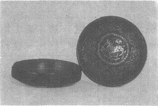 唐。高1.5厘米,口径3.8厘米。1970年陕西省西安市南郊何家村窖藏出土。陕西省博物馆藏。此盒盖中央为翼鹿,底部中央为孔雀,四周外壁饰飞鸟。通体饰珍珠地纹,十分华贵。