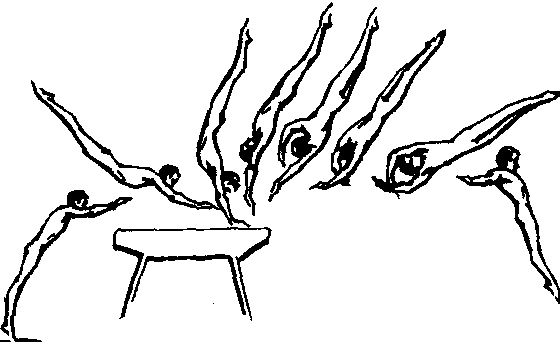 支撑跳跃中难度动作之一。推手形成的支撑反作用力,通过人体总重心的后方,使身体产生同向转动进入腾空,属手翻型动作。为前民主德国女选手扬茨首先完成,并于 1972年第20届奥林匹克运动 会中, 以它力挫群芳,登上女子跳马世界冠军的宝座。运动形态特征是:手翻推离后挺身沿纵轴转体360°。技术要点:起跳刚离板时,脚面发力带动下肢向后上方猛摆,两臂前伸,上体下压撑向器械,当掌根刚触马瞬间,急遽回腿上顶进行制动。随即猛烈推离。推离后随着人体倒飞,迅速梗头、含胸、留腿同时左臂贴紧胸前,右臂向耳侧旋靠并配合头部左转下梗带动绷紧身体进行转体。随后两臂侧举,留肩伸腿准备落地。初学时可采用横马(箱)结合高垫进行练习转体成俯卧和仰卧。保护者位于器械前高垫上,当其推离时,两手抄拨其腰侧,助其加快纵轴转体。当转体技术基本掌握后,可将横马放置在海绵坑边,进行直接练习。然后在技术熟练后,可转向纵箱、纵马练习。