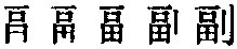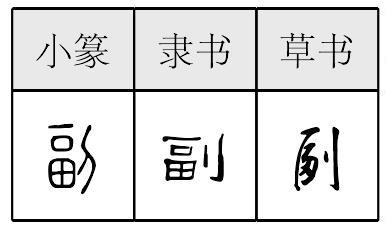 【提示】左下的田,中间一横宋体与两边相接,楷体与两边相离。 *副fù11画 刀部 (1) 居第二位的;辅助的:~主席|~团长|~教授|~食品|~标题。 (2) 辅助的职务:团~|队~|大~|二~。 (3) 附带的;次要的:~业|~作用|~产品。 (4) 相称;符合:名~其实。 (5) 量词。 1. 用于成对或成套的实物:一~手套|一~水桶|全~武装。 2. 用于面部表情:一~笑脸|一~满不在乎的样子|我这~老脸往哪儿搁。 副 ☚ 刻 剖 ☛ 副fù《说文》籀文从两畐,从刀。象刀分割形。小篆省一“畐”,从刂(刀),从畐声。本是剖分,破开义。引申为居第二位的,辅助的。现代汉语如:副主席|副排长。又为附带的或次要的。如:副业|副作用|副食。组词如:副本。又引申为相称(chèn),相配。如:名不副实(也通“符”)。又转为量词。如:一副对联|全副武装|一副笑容。或通“付”。 副★常◎常