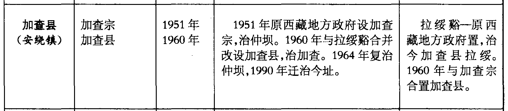 加查县(安绕镇)加查宗加查县1951年1960年1951年原西藏地方政府设加查宗,治仲坝。1960年与拉绥谿合并改设加查县,治加查。1964年复治仲坝,1990年迁治今址。拉绥谿—原西藏地方政府置,治今加查县拉绥。1960年与加查宗合置加查县。