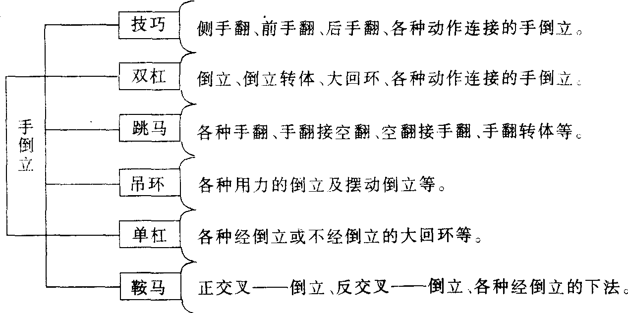 ❹综合转移。当一种技能的形成对一系列动作技能的形成产生积极影响时,就会发生纵向或横向的综合性转移。例如,掌握双杠挂臂摆动振浪技术的动作技能,可对一系列由挂臂撑连接的动作技能的形成产生积极的影响(纵向转移);掌握手倒立的动作技能,可对一系列与手倒立有关的动作产生积极的影响(横向转移,详见下表)。