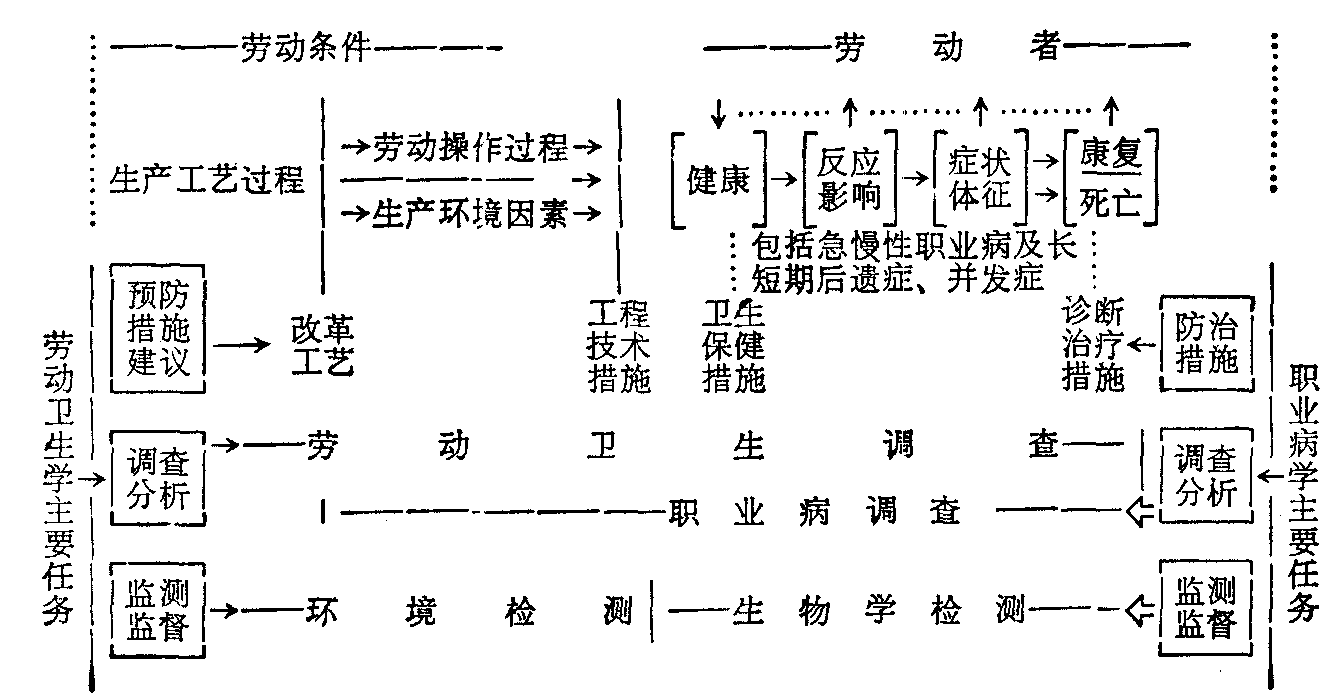 释义 | 劳动卫生学与职业病学/生产性有害因素/职业病/劳动卫生标准/职业危害的预防措施/劳动卫生与职业病调查/劳动卫生立法/劳动卫生的监督与管理 ☚ 劳动卫生概论 劳动卫生学与职业病学 ☛ 劳动卫生学与职业病学 劳动卫生学与职业病学劳动卫生学与职业病学是现代医学科学中研究劳动条件与劳动者健康之间关系的两门密切联系的学科。其目的都是为使劳动者在其所从事的生产劳动过程中,有充分的安全和健康保障,并为不断提高劳动生产率提供科学保证。