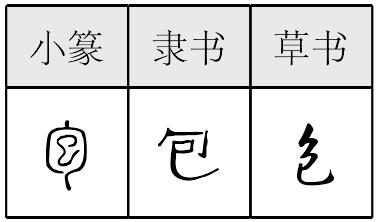 包 金文; 篆bāo[勹(bāo,意符)+(巳,子,意符)→包(《説文》:“象人褢妊,巳在中,象子未成形也。”包,像懷孕,胎兒在母體内,從勹(bāo)從巳〈巳即子〉。因爲“子被胎衣所包”。引申爲包圍、包裹、包攔。再引申爲承包,包打聽,包打天下。把事理容納在一起〈包含、包括〉,把壞人、壞事隱藏起來〈包庇〉。)] 《詩經·召南·野有死麕(jūn)》:“野有死麕,白茅包之。”(獐子死郊外,茅草包起來。) 趙樹理《小二黑結婚》:“兩個鬥爭會開過以後,事情包也包不住了,小二黑知道這事是合理合法的了,索性就跟小芹公開商量起來。” 包(bāo)“ ,象人褢妊。巳在中,象子未成形也。元气起于子。子,人所生也。男左行三十,女右行二十,俱立于巳,为夫妇。褢妊于巳,巳为子。十月而生,男起巳至寅,女起巳至申,故男年始寅,女年始申也。凡包之属皆从包。”(布交切) “包”字未见于商代西周文字,但《诗经》习见“包”字和“苞”字,说明两周时代应有“包”字。出土文献“包”字最早见于睡虎地秦简,作 。学者多说“包”为“胞”的初文。包从勹,表示包裹之义;从巳,巳像未出生小儿,二者合起来表示胞衣义。徐灏《注笺》:“包,古胞字。 象子未成形。从勹裹之。引申为凡包裹之称。段氏所引高注,乃阴阳家言,无关字义。许因 与巳午之巳相似,故举以为说。当以象形为正义,元气以下,皆余义也。”汉代阴阳家盛行,故许慎也难免偶尔采之以说字义。或说“元气起于子”为后人增之。 包部有两个属字。如“胞”字下云:“儿生裹也。从肉,从包。”又如“匏”字下云:“瓠也。从包,从夸声。包,取其可包藏物也。” 包bāo(5画)