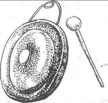 释义 | 包锣打击乐器。又称铜鼓、疙瘩锣。铜制。锣面径约300毫米,锣边较宽,锣心处有一乳状突起,高约30毫米。锣边上部有两孔,穿绳索做提手。演奏时左手提锣(或悬挂某处),右手持槌敲击。只辽宁鼓乐丧事时使用。后金(1616—1635年)时宫廷作乐时亦曾使用过。 包锣 |