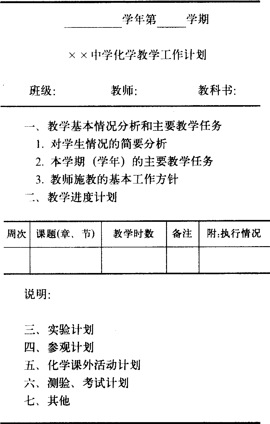 释义 | 化学教学工作计划 化学教学工作计划huaxue jiaoxue gongzuo.jihua通过备课预先拟订的化学教学的工作方案,是一定时间 (或一定内容) 教学过程的比较具体的规划。它是进行化学教学工作的蓝图,也是督促、检查和改进教学工作,积累教学经验的重要资料。制订周密可行的计划,是避免盲目性和混乱现象,提高化学教学工作效率和教学水平的前提。通常有学期 (或学年)计划、单元 (或课题) 计划和课时计划3种。它们的内容、要求和作用不同,相互之间是整体跟局部的关系。制订计划时,既要使同一年级的教学工作计划尽可能统 一,又应该从各班级的具体情况出发,不强求一律。 单元计划 (课题计划) 以学期 (或学年) 教学工作计划中相对独立的课题 (通常是一章教材) 为单元拟订的、一个单元的比较详细的教学工作计划。包括单元的教学目的、具体教学要求或教学目标,重点、难点和关键内容的分析,教学方法和措施,课时划分,实验、参观、化学课外活动的安排,教学测重和评价计划等内容。是在学期 (或学年) 计划基础上,结合本单元教学前的具体教学情况进行单元备课(课题备课) 的结晶。它应该在本单元授课之前完成。单元计划 (课题计划) 的格式一般如下: 第×单元《××××》课题教学工作计划 班级: 任课教师: 一、本单元的内容和体系 二、本单元在教学中的地位、作用和前后联系 三、本单元的教学目的和要求 四、本单元的重点、难点和关键内容 五、主要的教学策略和措施 六、课时分配和教学方法