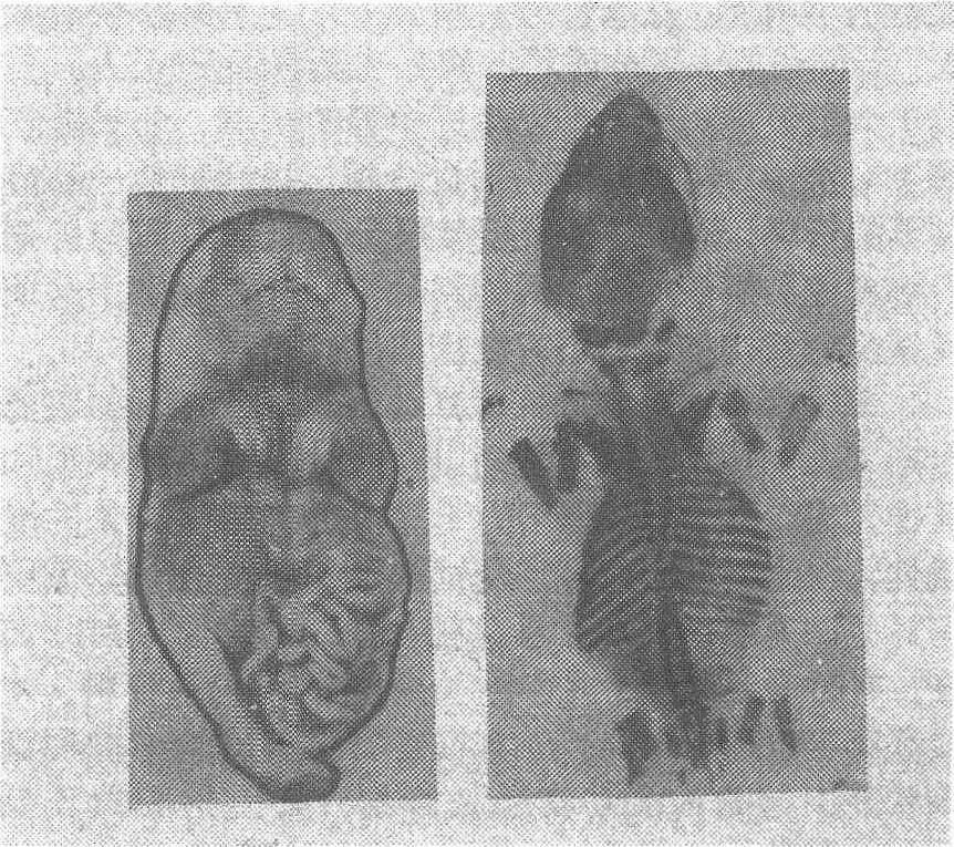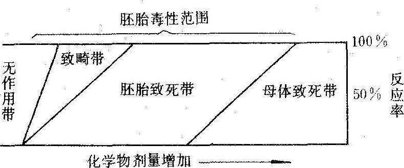 影响因素 致畸作用随致畸物的剂量、动物种属和胚胎发育阶段等而异。主要因素有:❶剂量。致畸物引起胚胎发育异常,基本符合剂量反应关系。每种致畸物均有引发致畸的阈作用剂量,高于此剂量时,在一定范围内,增大剂量其畸形发生率也增高,这可能与受损伤细胞数目增多有关; 如剂量过大时,出现胚胎死亡从而掩盖致畸作用的显现,使畸形率反而降低,故致畸物引起胚胎发育异常的剂量反应关系不能单独按畸形率计算,而应将畸形率加上胚胎死亡率计算。在致畸无作用剂量至胚胎死亡剂量之间存在着一个狭窄的致畸带,带宽的化学物比带窄的致畸危险性要大(图2)。 ❷种属差异。不同种属动物和同种属动物的不同品系,对某些致畸物存在明显差异。例如人和灵长类动物胚胎发育早期对反应停极为敏感,易诱发胎儿畸肢; 而家兔和小鼠则需较大剂量才能导致轻度畸形;其他大多数哺乳动物则不敏感。农药三环锡易诱 >图2 化学物的致畸带 ❸作用时期。胚胎对致畸物的敏感性随胚胎发育的不同阶段而异,一般在器官发生期对致畸物最为敏感,因此称为致畸的“敏感期”。此期在人是受孕第3~8星期;啮齿类动物则为第7~16天。在敏感期中的不同日期给予致畸物,会发生不同的器官畸形,这是由于各器官的发生过程并非完全一致,因此各自的敏感期也有所不同。 试验方法 最常用的动物是大鼠、兔和小鼠。选健康成年雌雄大鼠(1:1或2:1)同笼交配,次晨作阴道涂片或检查阴栓,发现有精子或阴栓的雌鼠为孕鼠,当天作为孕期零天。给药方式应与人摄入或接触方式相同,一般为灌胃、混入饲料中,经皮肤或经呼吸道等。大鼠给药时间为孕期的第6~15天,兔为第8~18天,小鼠为第6~14天。致畸试验至少应设三个剂量组,剂量上限是根据亚慢性(或亚急性)毒性试验得出的“最大无作用剂量”,下限相当最大无作用剂量的1/50,两剂量间再设一个中间剂量。对照组中还可选取某些已知致畸物作为阳性对照。 |